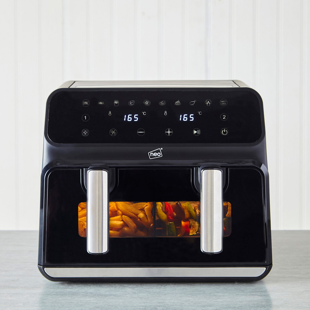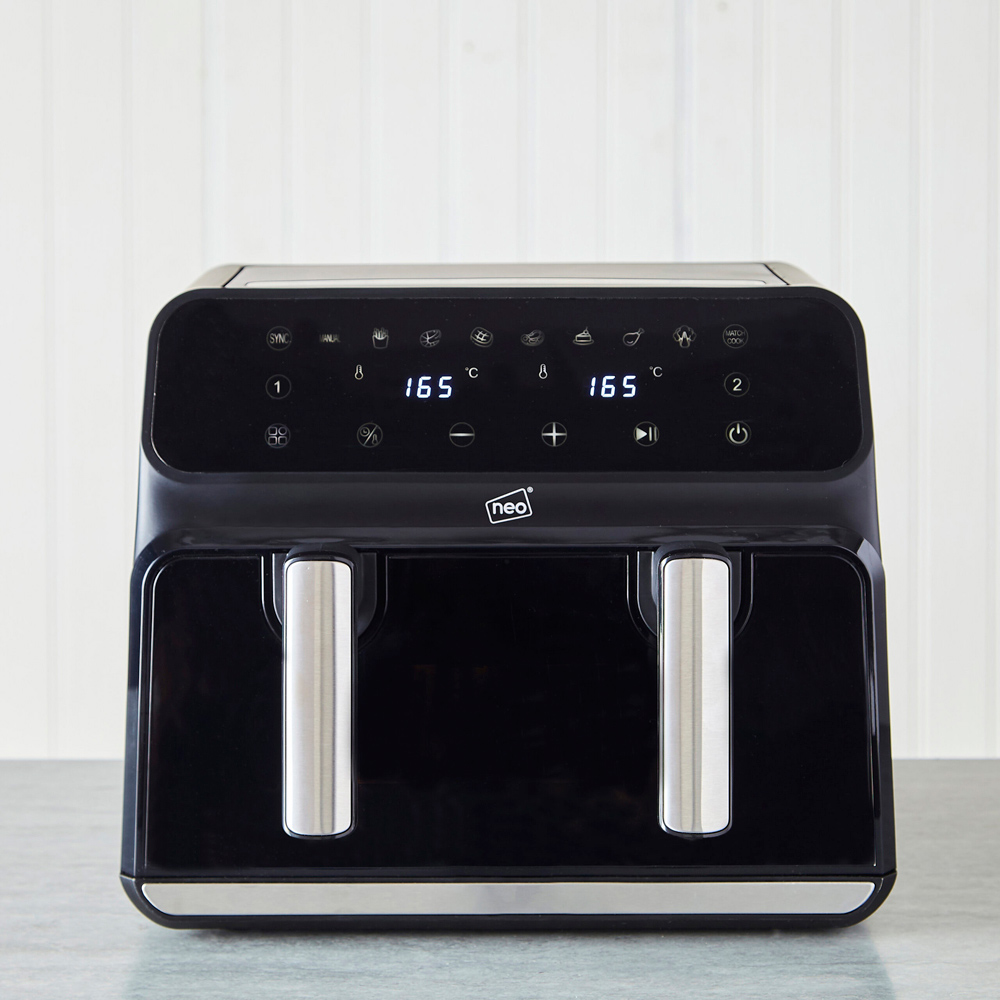 Whether you’re looking to cook crispy chips or roast a chicken, this air fryer from Neo can do it all. The 8.5L capacity means you can comfortably cook for the whole family, featuring the 4-in-1 versatility: Air Fry, Roast, Reheat, and Dehydrate. The digital display with a touch screen panel helps plan your preparation time. The double drawer feature allows you to cook different foods together. There is also an option to remove the internal divider to create one larger drawer. Double layer heat resistant tempered glass door can keep all the heat inside the device when cooking. You can also watch the progress of your food without needing to open the drawer. The air fryer is fitted with an automatic switch-off turning off the air fryer, so there is no danger of overcooking your food. Save time and cook healthy meals easier than ever, all at the touch of a button. Happy Frying!