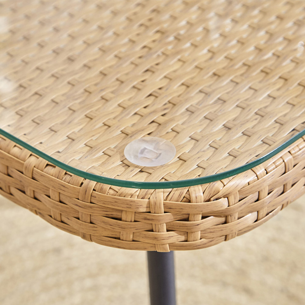 Enjoy your balcony or patio view whilst relaxing on this stunning Cream three-piece Bamboo Style Garden Table and Chair Bistro Set. Now you can enjoy a morning coffee, an afternoon tea or drinks in the evening. The natural bamboo effect garden armchairs offer comfort and contrast beautifully with the striking metal black legs. The chairs come with amply-filled cushions for comfort. The cushions can be removed and washed with a choice of natural or grey colours. The glass-topped garden coffee table makes it easy to wipe. This modern trend-forward set can be used in a conservatory. It makes a perfect addition to any conservatory or indoor space. The garden furniture set includes 2x rattan chairs and 1x glass-topped table. Protect your garden furniture with our durable and waterproof covers. Explore our wide range of heavy-duty Garden Furniture covers to find the perfect fit for your needs.