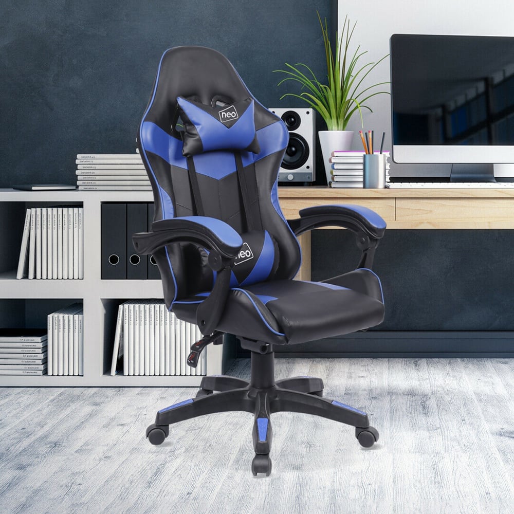The deluxe Neo branded fully recliner racing-style white computer office gaming chair is made with high quality PU leather. The computer office gaming chair combines multiple adjustable features, luxurious materials and Ergonomic design for comfort, with lumbar and headrest support. The office chair supports a new level of comfort for gaming, studying and working office environment. Colour: Blue.