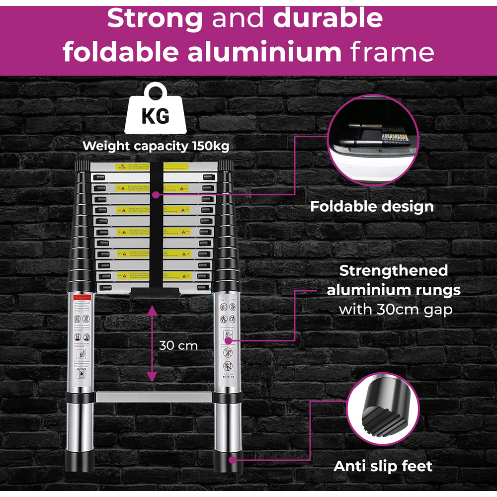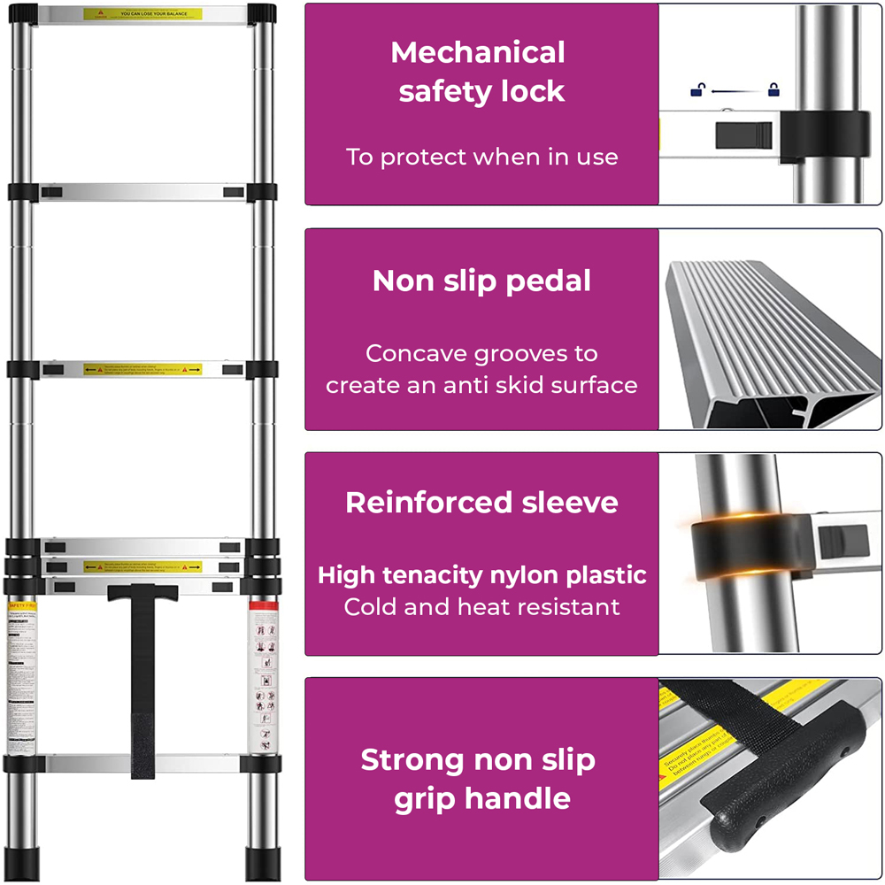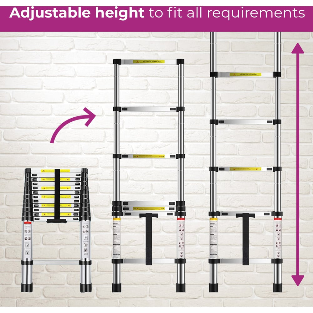 The Neo 4.6 metre telescopic ladder is a type of portable ladder that can be extended or collapsed by sliding sections of the ladder within one another. This design allows for easy storage and transportation. Compact Design: Telescopic ladders can be collapsed into a compact size, making them easy to store in tight spaces such as cupboards, cars, attics, utility rooms, sheds or storage rooms. It comes with adjustable Height, it can be extended to various heights. It is portable, lightweight and easy to carry. Easy to Extend and Retract: The telescopic mechanism allows for smooth extension and retraction of the ladder sections which makes it simple to set up the ladder quickly and safely. It offers versatility, as they are suitable for a variety of tasks, including home maintenance, painting, accessing shelves, and more. The ladder is durable, made from sturdy materials like aluminium or other lightweight but durable alloys, ensuring that they can support the user safely. When using a telescopic ladder, it’s important to follow the manufacturer’s instructions for proper extension and usage. Safety precautions should always be taken when working with any type of ladder, including ensuring a stable footing, maintaining a three-point contact with the ladder, and not exceeding the weight capacity.