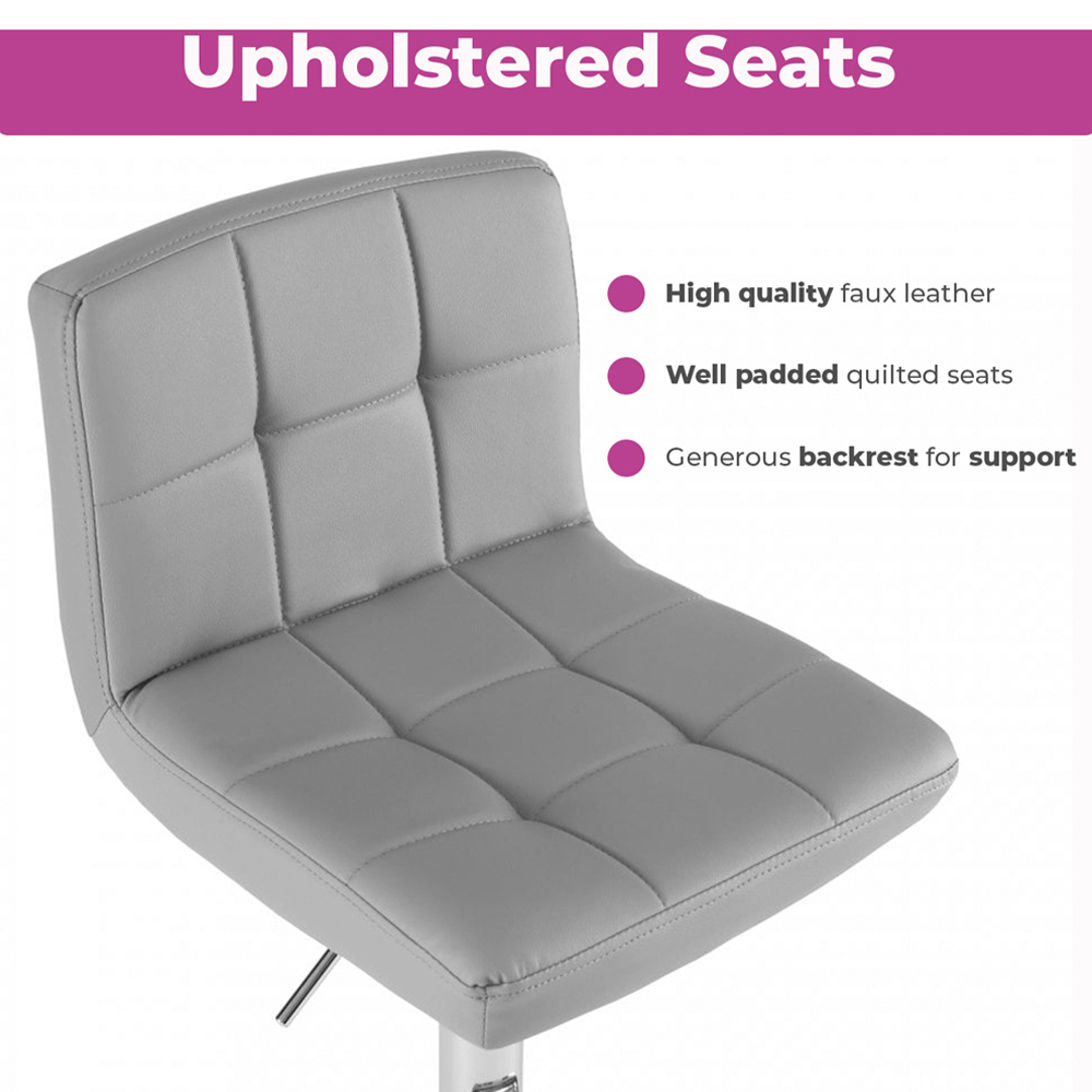Upgrade your bar space with the Neo Grey Leather Bar Stools. Upholstered in high-quality faux leather with ample padding and generous back support, these stools are super comfortable to use. Also, the seat stands on a chrome base, with a variable height gas lift and 360-degree swivel mechanism. For added convenience, the stool includes a footrest and a sturdy circular base with a rubber ring beneath to protect your floor. Set of 2.
