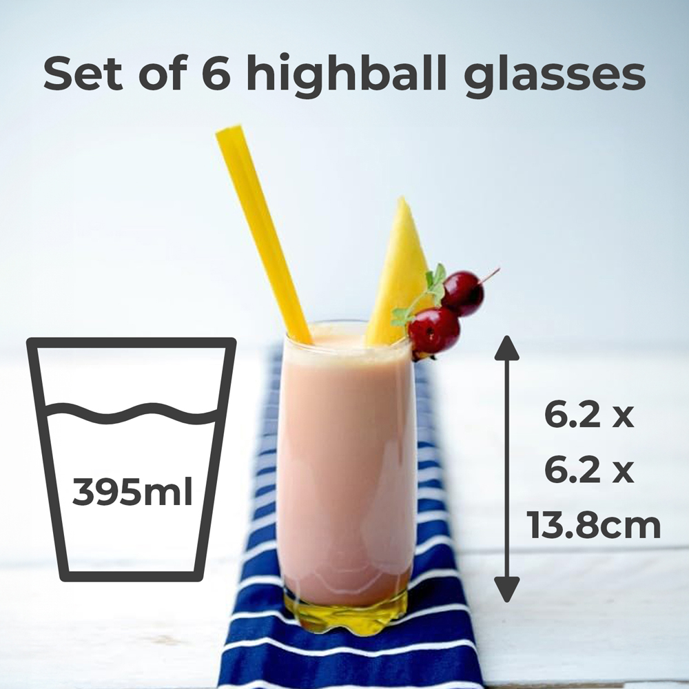The Neo Multicoloured Highball Glass 6 Pack with a touch of colour is a fantastic way to elevate your drinkware collection, adding both functionality and a splash of vibrancy to your table setting. Highball glasses are tall, typically cylindrical, and perfect for serving a variety of beverages, from cocktails and mixed drinks to water and iced tea. Each highball glass is crafted from high-quality, durable glass. The glasses are designed to be crystal clear, providing a pristine view of the beverage inside, while also featuring a touch of colour to add personality and style to your drinkware. These glasses are tall and cylindrical, with straight sides that make them ideal for a variety of drinks. The highball shape is perfect for drinks served with ice, as it provides plenty of room for both the liquid and ice cubes, ensuring a balanced and well-chilled drink. The glasses feature a touch of colour, subtle tints of soft blue, green, pink, deep purple, reds and orange. The colour is applied to the base giving each glass a unique and stylish appearance.