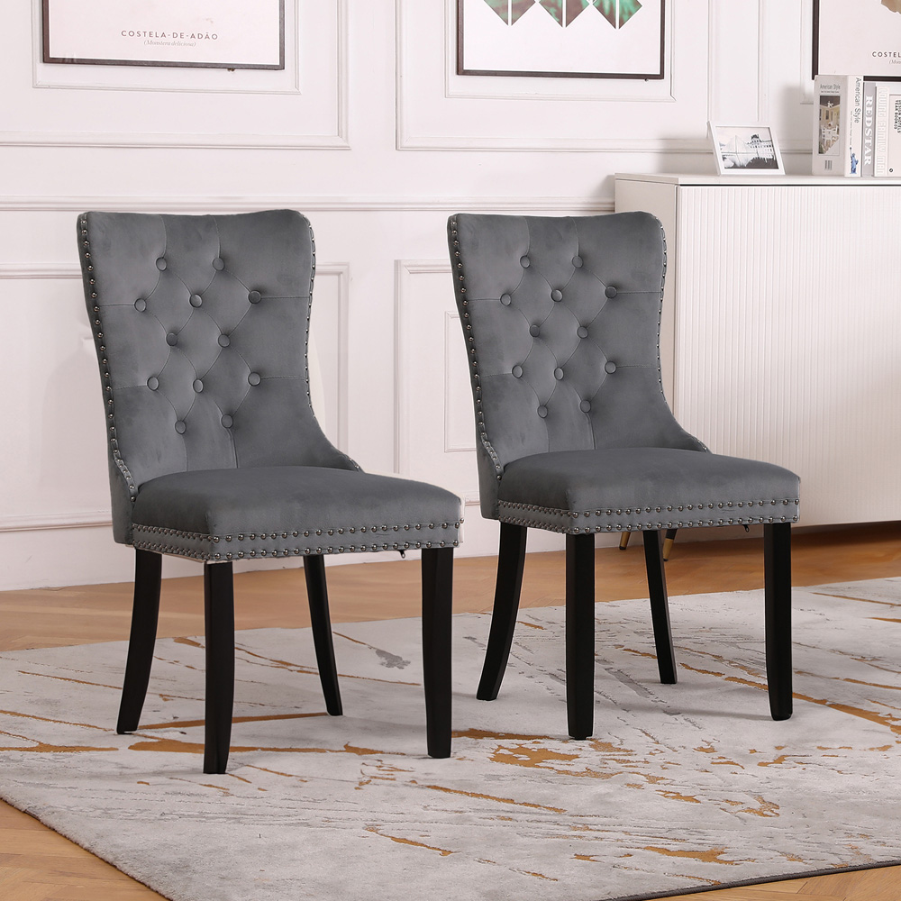 Add a touch of elegance to your dining table with this set of two Neo Dark Grey Studded Velvet Dining Chairs. The chairs are made using high-quality premium crushed velvet fabric. Soft to the touch but hard wearing. An ample cushioned seat offers a supreme level of comfort. It features a classic design with accent button stitch detailing on the backrest. Soft velvet back with diamond button detail – complemented with piano black wooden legs, nail head stud and pull ring knocker detail: the nail head studs are in an antique brass style, which adds to the classic style of the chair.