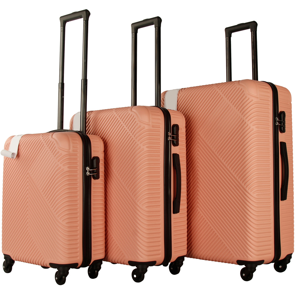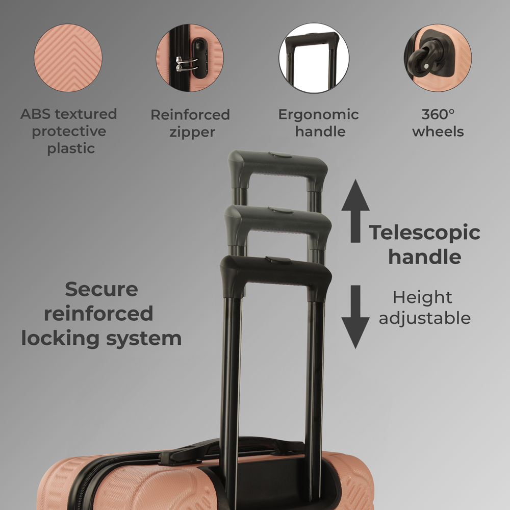 Enjoy travelling and carry all your essentials safely with the Neo Set of 3 Rose Gold Hard Shell Luggage Suitcases. This set is crafted to cater to various travel needs, providing a comprehensive solution for different trip lengths and packing requirements. This set comprises three versatile sizes, ensuring you have the right suitcase for different travel durations and requirements. The set includes a 28-inch large suitcase, a 24-inch medium-sized suitcase and a 20-inch small suitcase that offers enough space for clothes and essentials. This set is crafted with sturdy, lightweight and impact-resistant ABS plastic for extra durability. The outer shell is designed to be rigid and protective, providing enhanced protection for your belongings during travel. The outer shell has a beautiful, scratch and scuff-resistant surface, which is ideal for all types of travelling purposes. The interior features a polyester fabric inner lining with a zip compartment and straps to keep your belongings secure. This helps in protecting your clothes and other items from scratches and abrasions. These suitcases also feature built-in locks with three combination numbers and double-row spinner wheels with 360-degree movement. The spinner wheels and robust telescopic handles make it easy to navigate through airports and other travel spaces. Dimensions: 20 inch: 55.5 x 34 x 21cm, weight: 2.55kg. 24 inch: 68 x 45 x 26cm, weight: 3.35kg. 28 inch: 78 x 50 x 30.5cm, weight: 4kg.