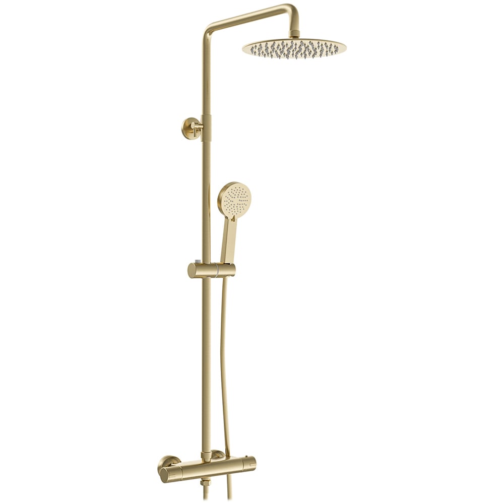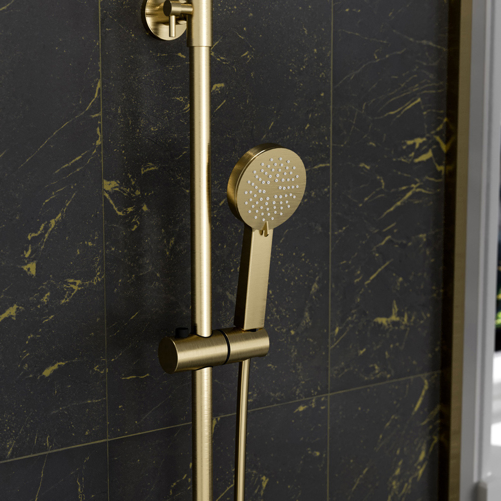 This thermostatic shower mixer with a bar valve allows you to halt or control the flow of your shower, whilst the thermostatic control gives complete temperature performance. The stunning brushed brass finish adds a touch of warmth and luxury, bringing elegance and sophistication to your bathroom. The left handle on the bar shower controls the water on/off and diverter to switch between both the outlets; round shower head and shower handset and the right handle controls the temperature, with a range of 20-50°C, which also has a safety stop preset as a set temperature of 38°c for comfort and safety.