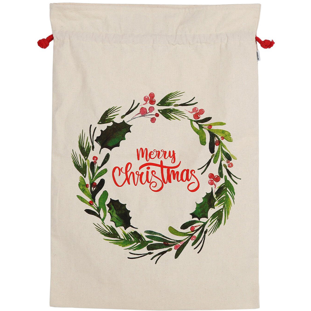 This fabulous Merry Christmas Wreath Sack is a unique and reusable alternative to gift wrap. Featuring a festive merry Christmas wreath design and matching red twine, making it the perfect place to store presents under your tree. This charming festive gift sack is sure to get everyone excited for the big day and fill your home with Xmas joy.