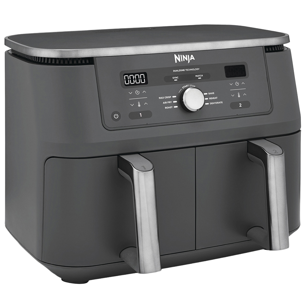 Dual Zone cooking just got a brand new look. Meet the large capacity air fryer that cooks 2 foods, 2 ways, and finishes at the same time – now with an updated design and sleek, dark grey metallic trim. Cook up to 25% more: The large 9.5L capacity is perfect for feeding up to 8 people, fitting up to 1.4kg of fries or a 2kg chicken in each drawer. 2 Independent Cooking Zones: Mix and match cooking functions, times and temperatures across 2 separate cooking drawers to create endless meal options. Get creative with 6 ways to cook: Air Fry, Max Crisp, Roast, Bake, Reheat and Dehydrate. SYNC: Cook 2 different foods with different temperatures, times and settings using 2 separate cooking drawers – and have both ready to serve at exactly the same time! No need to use different appliances, or let your side go cold while your main finishes cooking. It’s also perfect for catering to two different dietary requirements. Use the MATCH feature to duplicate the same function, time and temperature settings across both drawers – perfect for doubling your serving size, or cooking two different foods with the same instructions. Save up to 65% on your oven energy bill: Quickly cook up to 75% faster than fan ovens. Air Fry healthier versions of your favourite fried foods using little to no oil – up to 75% less fat than traditional frying methods. Easy to clean: The non-stick drawers and crisper plates are dishwasher-safe for easy clean-up. Testing and calculations based on the recommended cook time for sausages, using the air fry function versus conventional ovens. Tested against fish fingers and sausages, including pre-heat. Tested against deep-fried, hand-cut French fries.