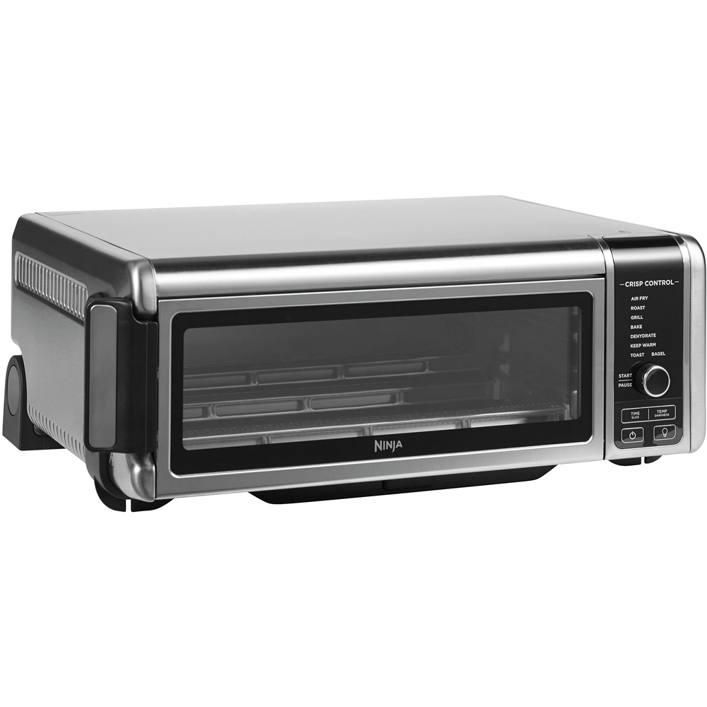 The oven that crisps and flips up and away is more than a mini oven, offering eight cooking functions: Air Fry, Roast, Bake, Grill, Dehydrate, Toast, Bagel, and Keep Warm. It is up to 50% faster than fan ovens, allowing for the quick and easy creation of delicious family meals in 20 minutes with a super-quick 60-second preheat time (tested against sausages and fish fingers). Purposefully designed for traybake meals, it can prepare tender baked salmon, lemon and herb chicken breasts with crispy potatoes, cheese-topped nachos, homemade pizza, toasted sandwiches, roast vegetables, freshly baked cookies, and more, making it perfect for food and dishes up to 5cm in height. It achieves up to 75% less fat than traditional frying (tested against deep-fried, hand-cut French fries) while using little or no added oil, allowing for the same great taste with dishes like golden French fries and chicken goujons. The digital crisp control technology ensures perfectly cooked food inside and crispy outside, with six infrared heating elements enabling a wide temperature range, while variable airflow circulates hot air around the food at different speeds for quick and even cooking and crisping. Each cooking function is digitally programmed to vary temperature, heat source, and airflow for optimal cooking results. The design reclaims counter space by allowing storage on its side, taking up 50% less space. This unique feature flips up and away for compact storage and easy cleaning, with a removable crumb tray and accessible back panel for simple maintenance. The large capacity accommodates a 33cm pizza, 1kg of fries, or six slices of bread. It is easy to use, featuring a digital display, timer, and interior light, with an inspiring chef-created recipe guide included in the box. The Ninja guarantee provides peace of mind with a free two-year guarantee upon registration (UK & ROI only).