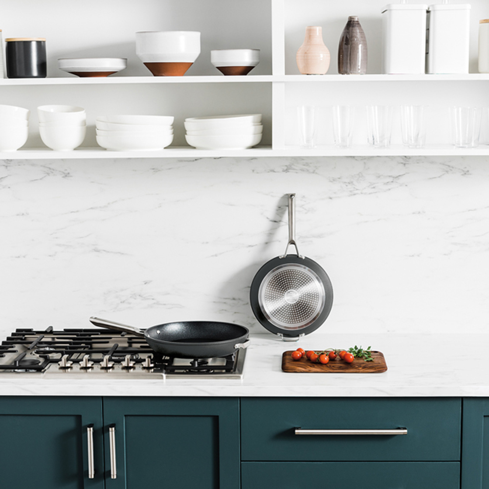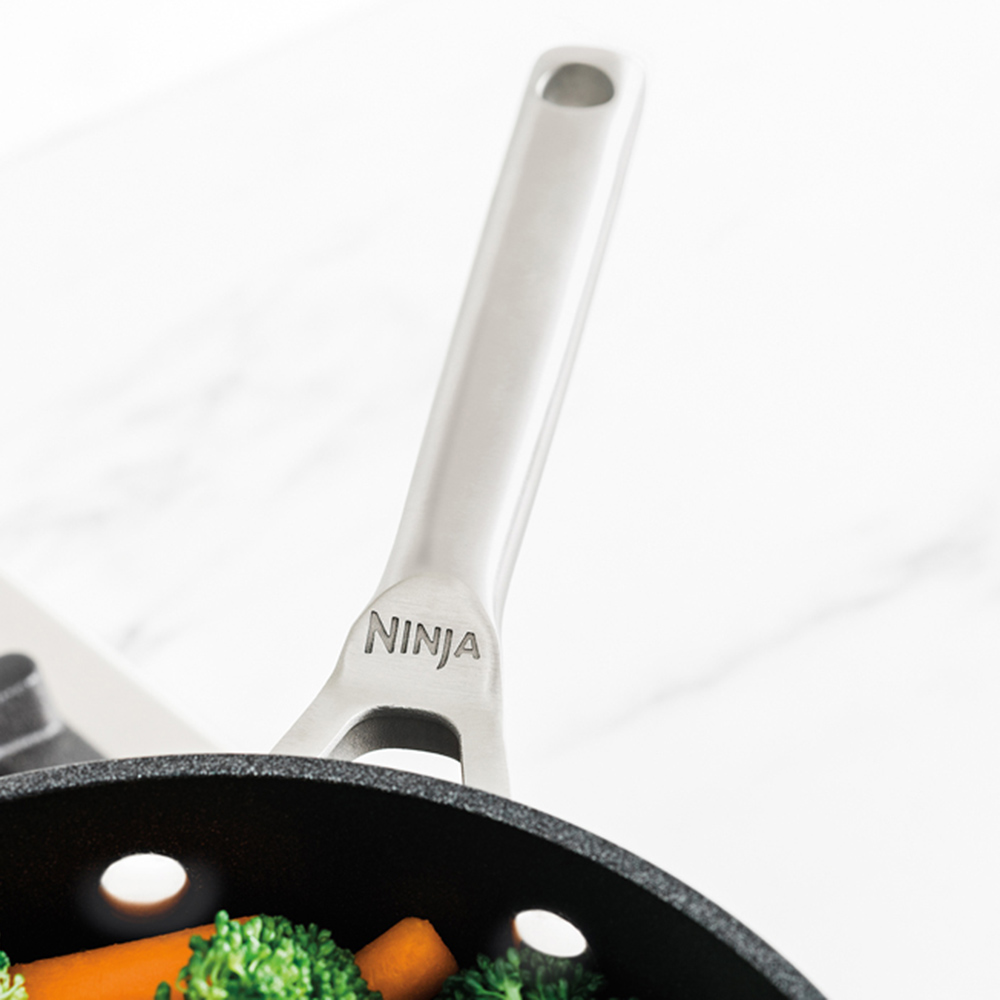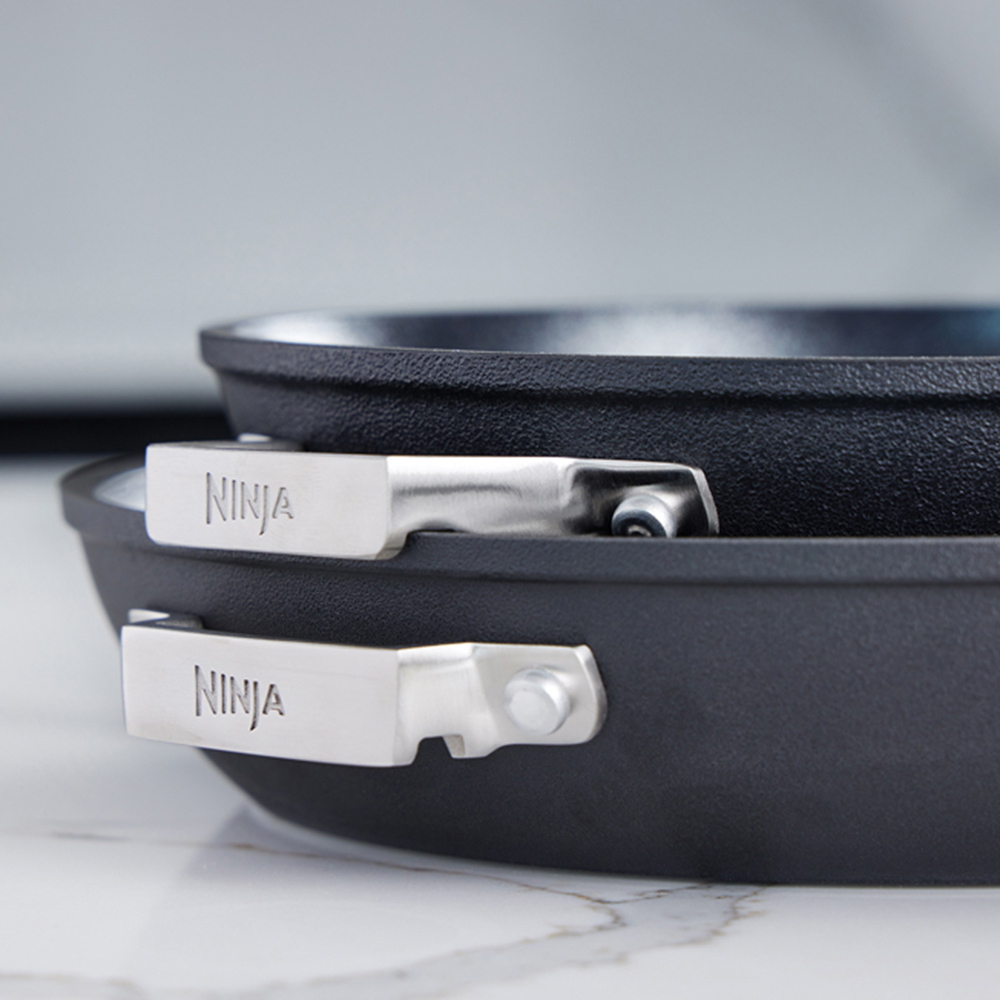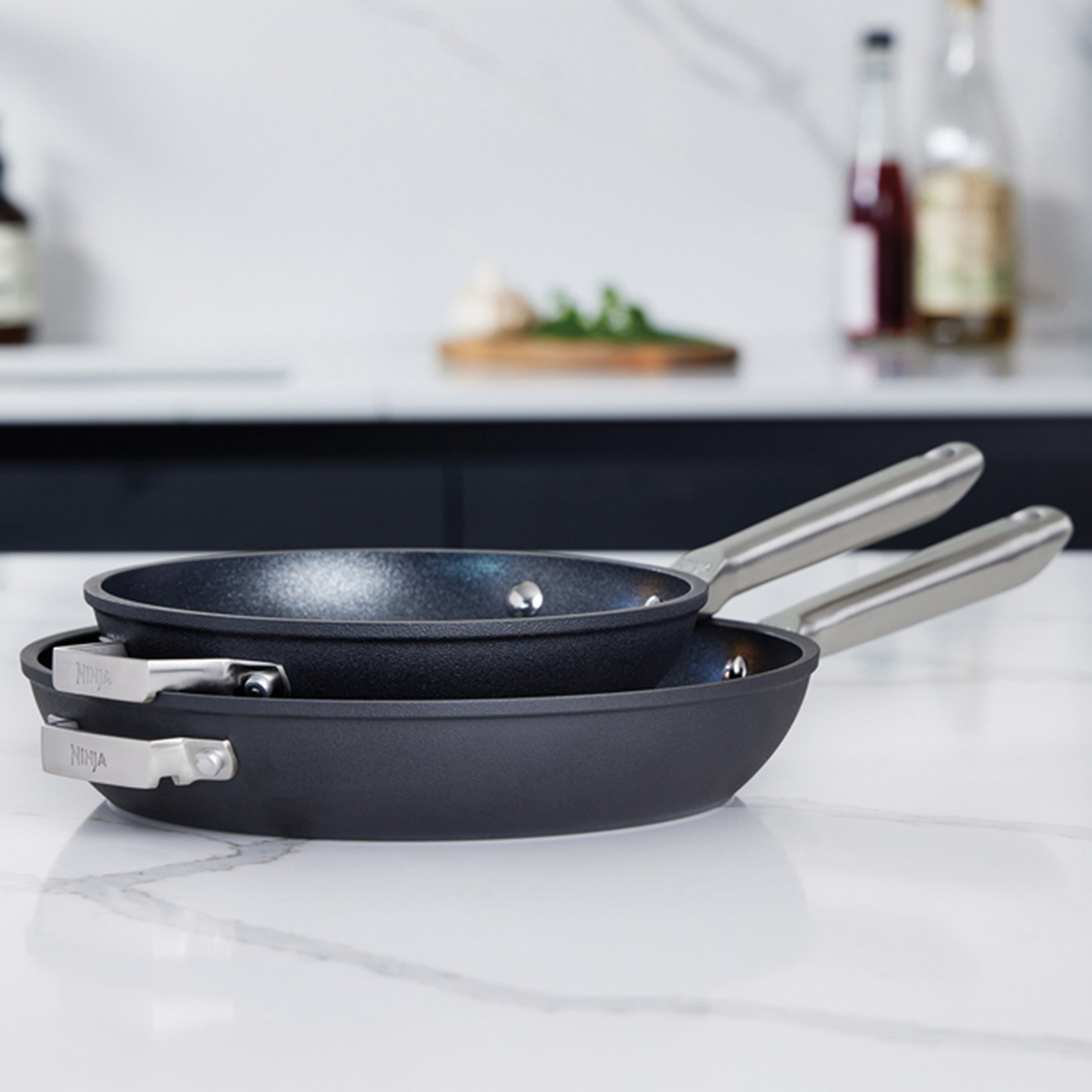 Prepare delicious meals for your family with the Ninja Foodi Zerostick 2 Piece Stackable Frying Pan Set. This set is up to 20 times tougher than traditional non-stick cookware. It is durable and long-lasting, backed by a 10-year replacement guarantee, which includes the zero stick coating. This stackable set securely nests together to protect the pans’ cooking surfaces, so they don’t touch during storage. The set is precision-engineered at 17,000°C, which fuses plasma ceramic particles to the surface and creates a robust, textured surface that interlocks with exclusive coating. This durable textured cooking surface is safe for metal utensils, scratch-resistant, and dishwasher-safe for easy cleaning. This cookware set is free from PFOA, lead, and cadmium. Made from durable forged aluminium with a hard-anodized exterior, it features cast stainless steel handles that provide a comfortable grip. The set includes two frying pans set (20 cm and 26 cm). The induction hob compatibility is as follows: the 20 cm frying pan fits a 13 cm induction ring, and the 26 cm frying pan fits a 17.5 cm induction ring.
