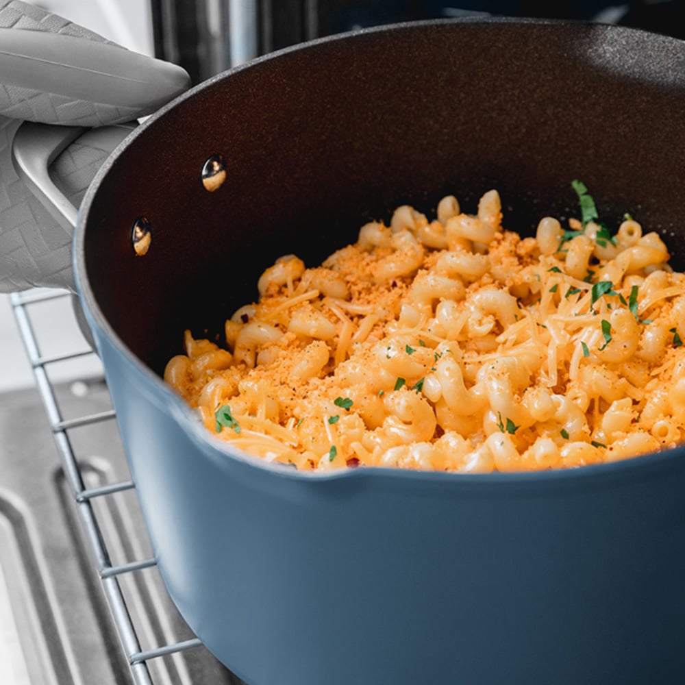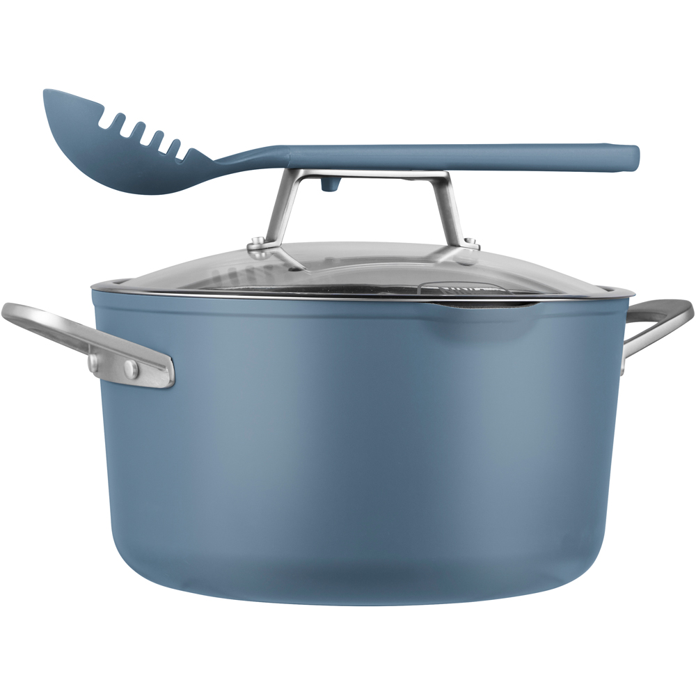 Create a variety of delicious soups and stews for friends and family using the Ninja Foodi Zerostick 8-in-1 Blue Macaron Aluminium Possible Pot. This versatile pot can steam, simmer, roast, braise, bake, saute, sear, and boil, allowing you to prepare everything from hearty roasts to light snacks and homemade desserts—such as roasted lamb shank or a deep-dish rhubarb crumble. It can replace five pieces of cookware, functioning as a stock pot, saucepan, roasting pan, baking dish, and steamer. The pot is oven-safe up to 260°C and compatible with all hob types, including induction. You can start cooking on the hob, finish in the oven, and then serve directly from the elegant matte pot, which also serves as a stylish serving dish. This all-in-one pot is designed with an integrated stainless steel roasting and steaming rack. Its extra-large 6.6L capacity accommodates a whole 2.2kg roast chicken. All components nest together for convenient, space-saving storage. The heat-tempered glass lid includes a built-in strainer for easy pasta draining and a multifunctional utensil that acts as both a ladle and a pasta fork. Durable and long-lasting, the pot features ultra-high heat plasma ceramic bonding and an exclusive coating that resists chipping, flaking, and peeling. It comes with cast stainless steel handles and two pour spouts. Made from forged aluminium, it quickly distributes and retains heat for even cooking and excellent searing. The Possible Pot is safe for metal utensils, scratch-resistant, and dishwasher-safe for easy cleanup. It is backed by Ninja’s 10-year replacement guarantee, which includes the ZEROSTICK coating.