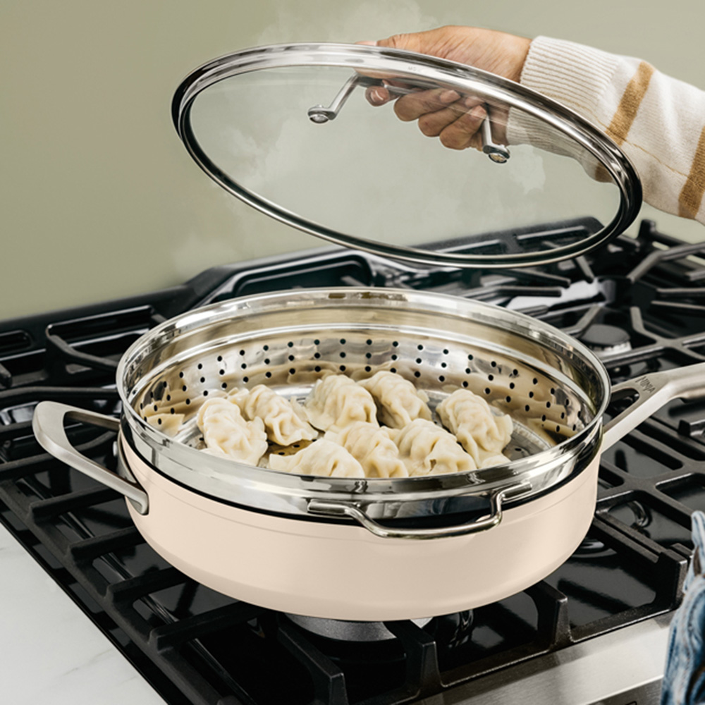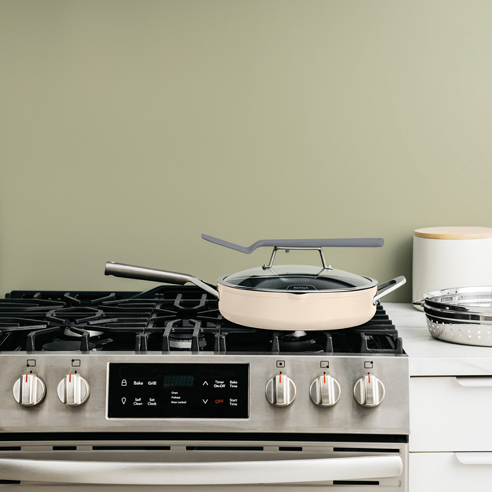 Create a variety of delicious soups and stews for friends and family using the Ninja Foodi Zerostick 9 in 1 Vanilla Bean Aluminium Possible Pan. This versatile pot can steam, simmer, roast, braise, bake, saute, sear, boil and fry allowing you to prepare everything from hearty roasts to light snacks and homemade desserts—such as roasted lamb shank or a deep-dish rhubarb crumble. It can replace eight pieces of cookware, functioning as a frying pan, sauté pan, skillet, saucepan, steamer, roasting pan, baking dish and strainer. The pot is oven-safe up to 260°C and compatible with all hob types, including induction. You can start cooking on the hob, finish in the oven, and then serve directly from the elegant matte pot, which also serves as a stylish serving dish. This all-in-one pan is thoughtfully designed with an integrated stainless steel steamer – perfect for dumplings, vibrant vegetables and more – which doubles up as a strainer for draining pasta. The heat-tempered glass lid features a convenient integrated spatula for easy scooping, scraping and serving. Durable and long-lasting, the pot features ultra-high heat plasma ceramic bonding and an exclusive coating that resists chipping, flaking, and peeling. It comes with cast stainless steel handles and two pour spouts. Made from forged aluminium, it quickly distributes and retains heat for even cooking and excellent searing. The Possible Pot is safe for metal utensils, scratch-resistant, and dishwasher-safe for easy cleanup. It is backed by Ninja’s 10-year replacement guarantee, which includes the ZEROSTICK coating.