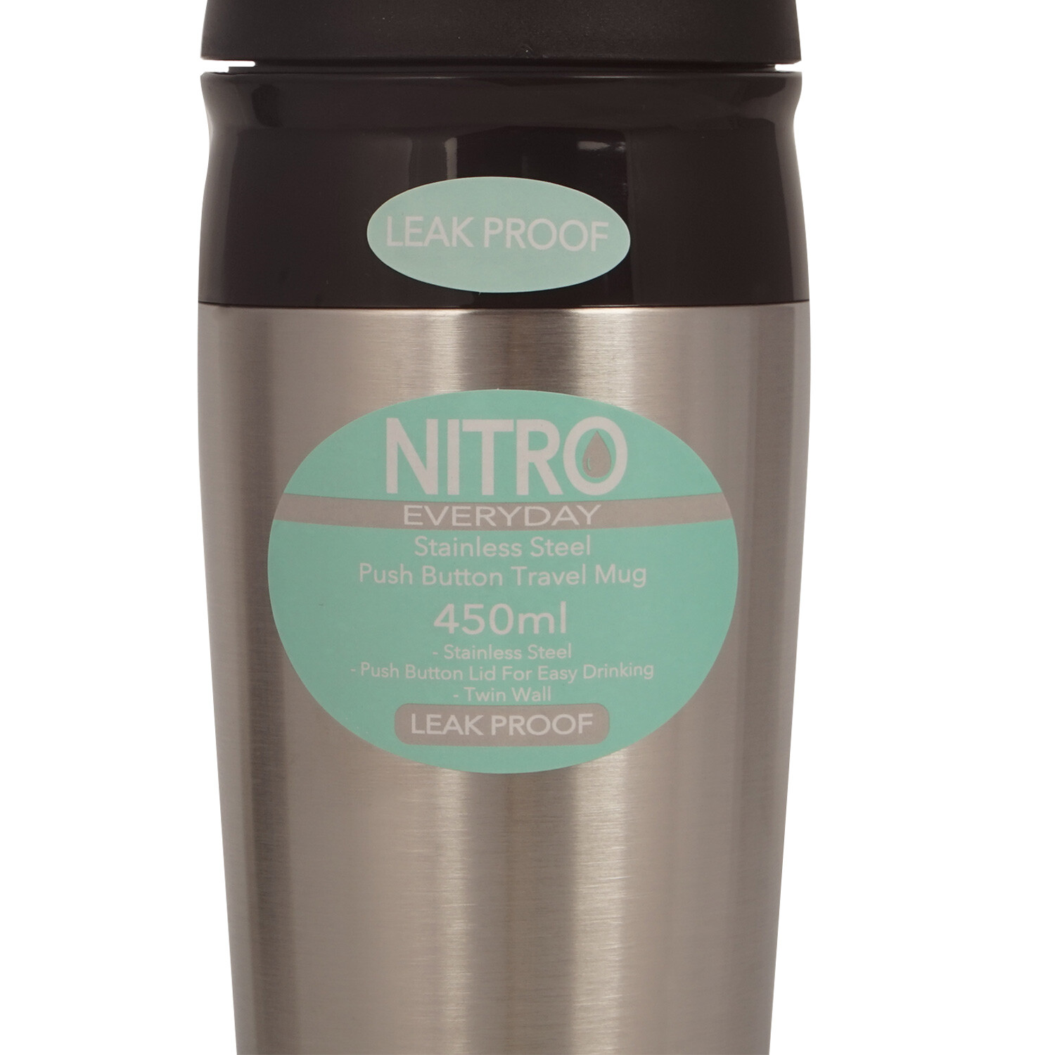 The Nitro Push Button Travel Mug is a must-have for any kitchen collection. The mug has a leakproof design with a twin wall vacuum to keep hot and cold drinks at their ideal temperature for longer. The flask is finished with a push-button lid for easy drinking and a handle for portability. It's easy to slip into your bag, ideal for home, school, and trips away.