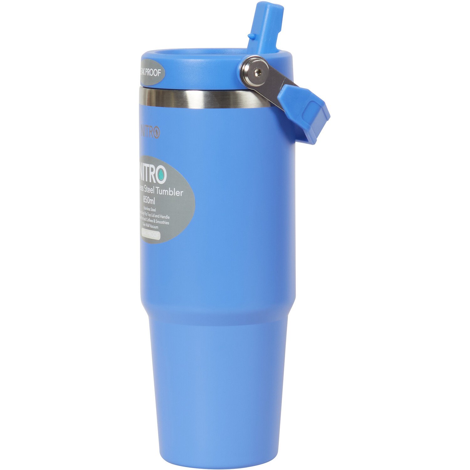 Carry your favourite drink or beverage in style using this Nitro Stainless Steel Tumbler. Available in bright blue or sage green, it features a twin-wall, vacuum-insulated structure with a leakproof design to prevent spillage. It also features a heavy-duty flip-top lid with a straw for added convenience and a handle so you can carry it with ease. With a generous 850ml capacity, the tumbler is perfect for smoothies, iced coffees, and more.