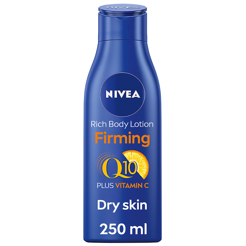 Hydrate your skin with the Nivea Q10 Plus Vitamin C Rich Firming Body Lotion 250ml. This body milk is infused with Q10 and vitamin C to help reduce visible signs of ageing. It provides deep hydration and nourishment for dry skin, leaving it soft and smooth. Suitable for daily use, it supports firmer, healthier-looking skin.