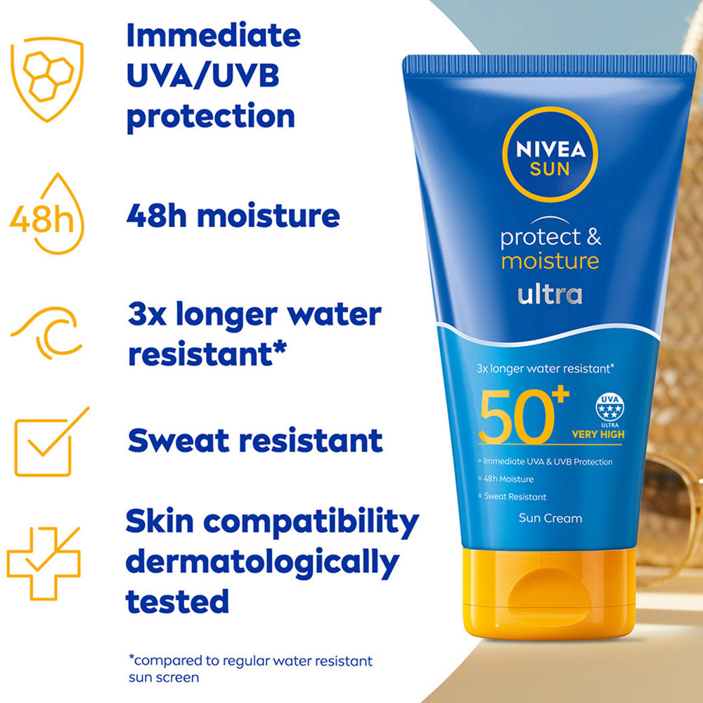 Protect your skin against harmful UV rays with this Nivea Sun Protect and Moisture Ultra Sun Cream SPF50+. This sun cream provides immediate UV defence and supports the skin with anti-oxidative Vitamin E to keep it moisturised for up to 48 hours. With complete protection, this cream is perfect to shield your skin against sunburn and long-term skin damage. Featuring a 3x longer water-resistant formula, this cream is 77% biodegradable and respects the ocean by being free from UV filters octinoxate, oxybenzone, octocrylene and free of microplastic. Also, the product packaging comes with a 50% recycled tube and cap. For external use only. Always read the label. Size: 150ml.