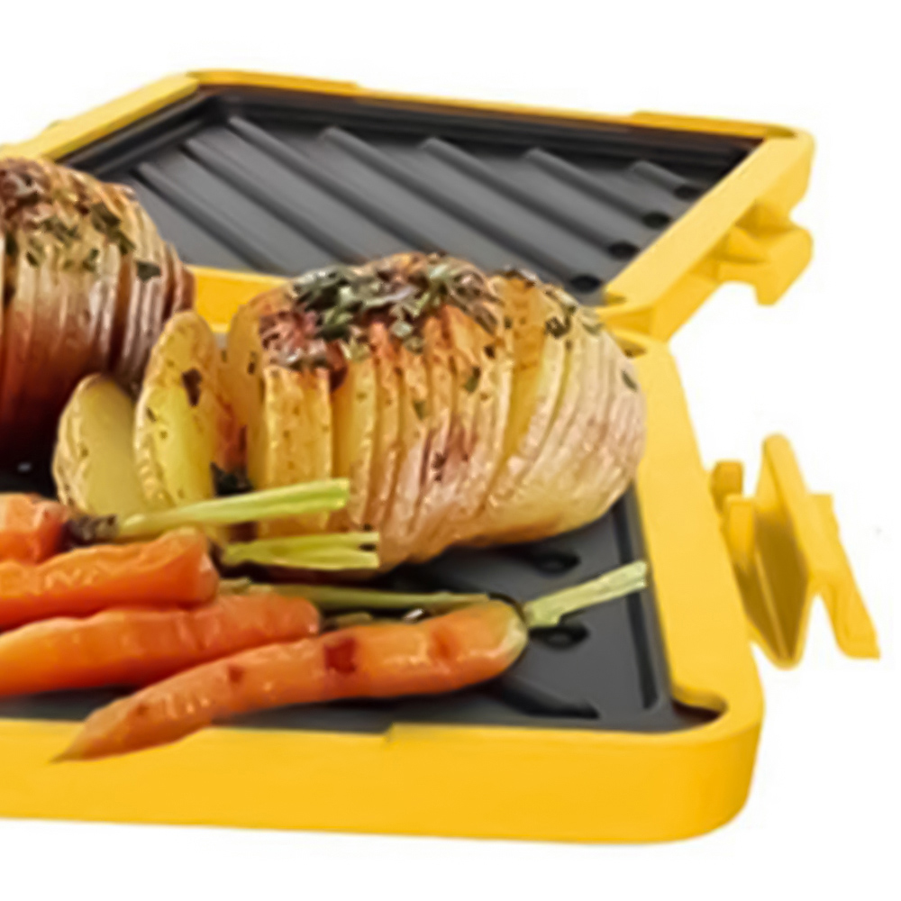 Upgrade your kitchen with this Non-stick Yellow Sandwich and Grill Microwave Toastie. This kitchen accessory features advanced heatwave technology, making it an ideal accessory to enhance your kitchen experience. The non-stick grill plates make cleaning fast and super easy. It's completely dishwasher-safe! It has a silicone finish for easy handling. This toastie offers you tasty, fast food at home with no preheating required and mimics conventional cooking methods, meaning lunch is ready within minutes. From buttery croissants to bagels, paninis and more, the device is versatile and is an all-round great kitchen companion. The streamlined takes up a fraction of the space and is easy to pull out and tidy away, making it perfect for students, house shares and other smaller spaces.