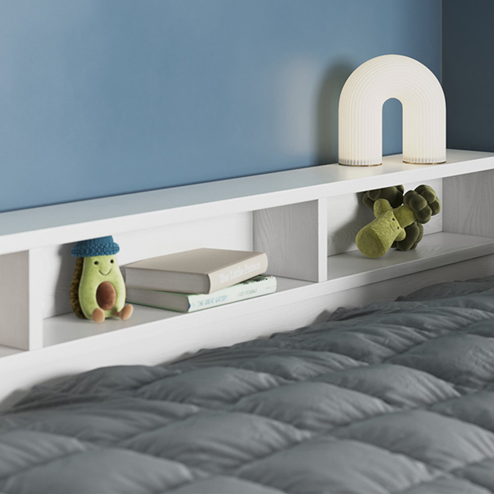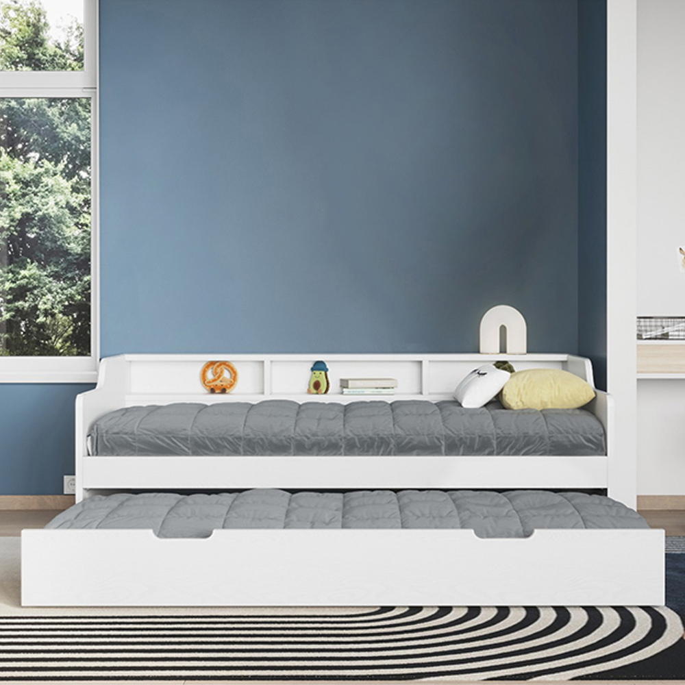 Redefine your sleep sanctuary with the Noomi Enzo Single White Wooden Day Bed with Trundle. This day bed features a sleek grey colour and a roll-out trundle bed, which makes it perfect for accommodating guests or sleepovers. The robust frame is crafted with Scandinavian pine, which ensures durability and longevity. With its double-shelf style layout, the bed provides three open areas for storing various bedroom items. It is designed to accommodate a UK single mattress configuration. For safety reasons, it is recommended to use a mattress no thicker than 16cm for the main bed and 12cm for the pullout trundle mattress.