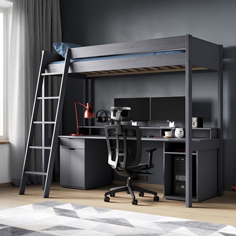 Transform your bedroom into the ultimate gaming oasis with Noomi Tera Single Grey Gaming High Sleeper. Featuring a roomy continental bed, ample storage, and a built-in hard MDF desk, this unit is designed to maximise space and create a breathable environment, even in a compact room. Crafted from FSC-certified Scandinavian pine, known for its straighter, stronger growth with fewer knots due to the cold Nordic climate, this bed is durable and environmentally friendly. Coated with a non-toxic, eco-friendly water-based paint, each piece of pine is moisture tested to ensure a robust, long-lasting build. This incredible space saver requires a single continental-size mattress. Get ready to elevate your gaming experience with this innovative and stylish solution.