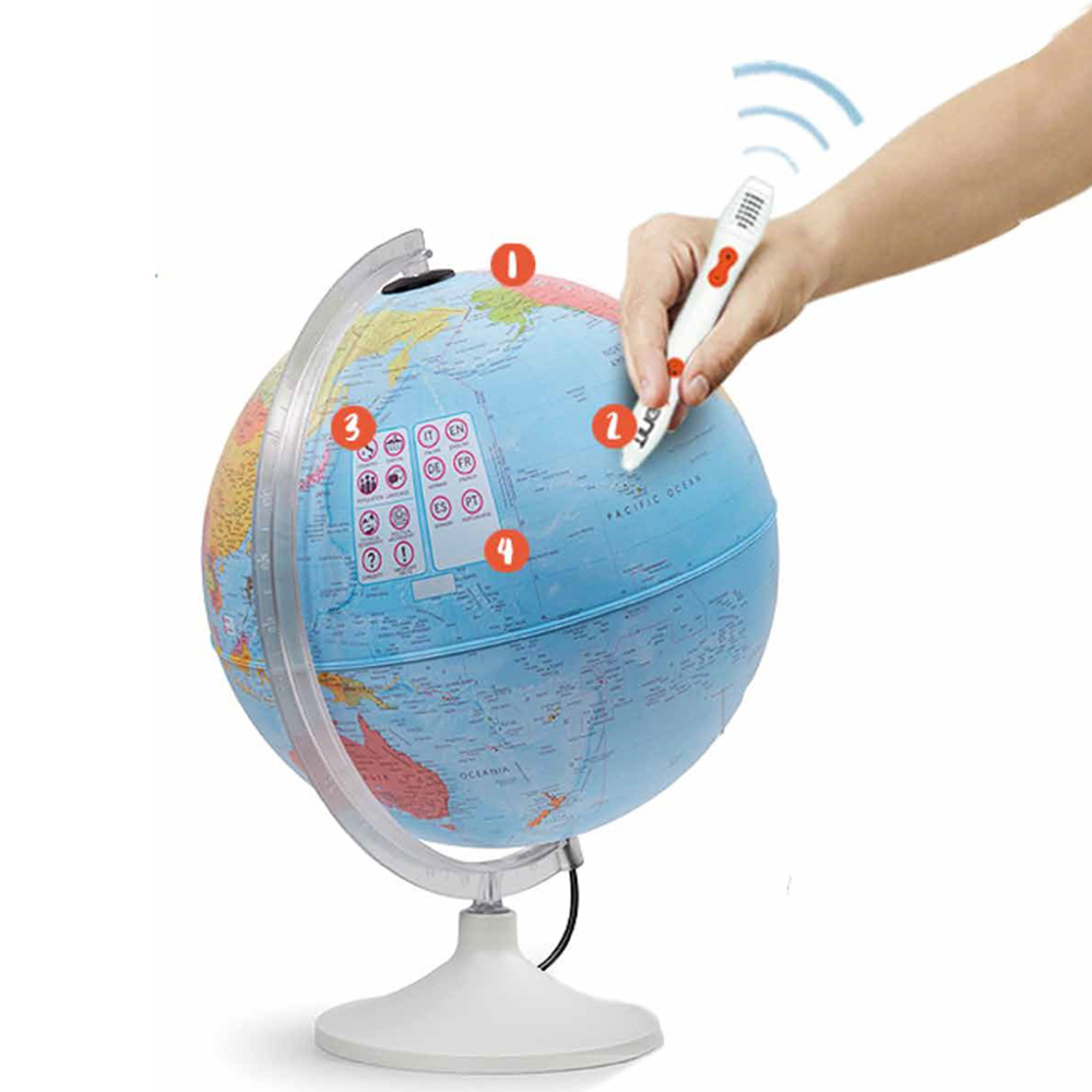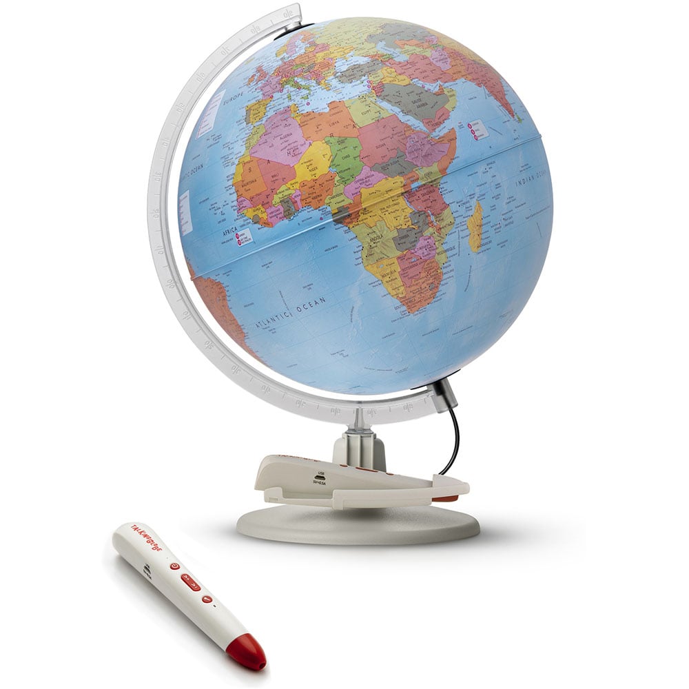 Spark curiosity and inspire learning with an interactive globe featuring an illuminated political map, perfect for exploring world geography in six languages and eight fascinating subjects. Children can engage with a talking globe using the included Ting Pen, making every discovery fun and educational. A white plastic base and arc give it a clean, modern look, while the 30cm size ensures details are easy to see whether it's day or night.