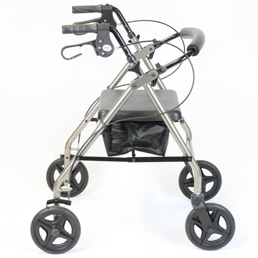 This stylish petite, lightweight, aluminium Rollator is a feature-rich walking aid. With a strong aluminium frame, the lightweight rollator is durable enough for daily use. With anatomically designed handgrips, arthritic-friendly loop cable brakes and height adjustable handles, this petite Lightweight Rollator is suitable for elderly, infirm or less able users with little grip power. This four-wheeled rollator also features a padded seat for taking a well-earned rest if needed. The seat flips up so you can place things in the handy bag below and the frame folds for easy storage.