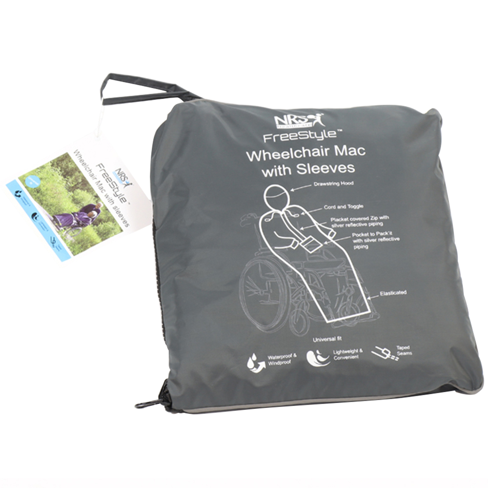 Designed to keep you comfortable in wet weather, the grey Wheelchair Mac is easy to wear and simply slips over your head to ensure you remain dry. Made from polyester with a PVC coating, the Mac benefits from an easy pull zip closure and a drawstring hood for extra protection from the rain. Covering the whole body and secured with elastication Slots in the back allow pushing handles to be used. Washable at 30°C, do not tumble dry or iron, line dry.