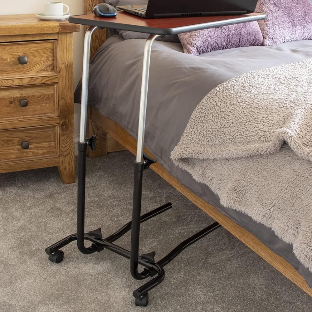 Made from light and durable, powder coated steel, the Wheeled Over Bed or Chair Table is easy to assemble and comfortable to use. Adjusted to a height that suits your needs, it simply rolls underneath your armchair or bed frame thanks to its four wheels. The table top can then be angled to accommodate food, drinks, books or even jigsaws so that you can eat or enjoy activities comfortably in your bed or chair. The lip all the way around the table tops edge prevents items sliding off. Please note that the design of the hand wheel adjusters on these tables may vary from that shown.