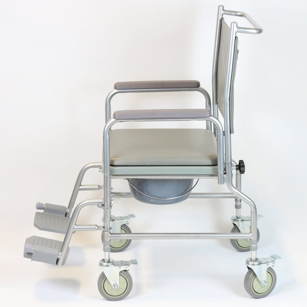 The NRS Healthcare Height Adjustable Wheeled Commode is a robust, mobile commode with great hygiene features.