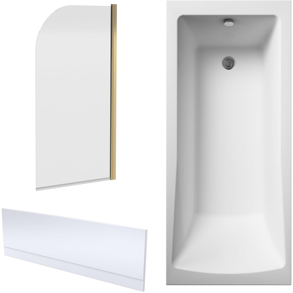 Transform your bathroom with a smart and practical 1700 x 700mm bath panel and glass screen combo that brings both style and function to your daily routine. Enjoy a crisp white finish and a safety glass screen that fits seamlessly with standard baths, making cleaning and maintenance easy so you'll spend less time worrying and more time relaxing. It features square single ended bath along with a round bath screen with an aluminium profile finished in brushed brass. Please note that the end panel is not included. It comes un-drilled, and a sturdy leg set is supplied for easy installation and added support. Shower Bath: 1700 x 380 x 700mm. Panel: 1700 x 35 x 510mm. Screen: 1435 x 38 x 785mm.