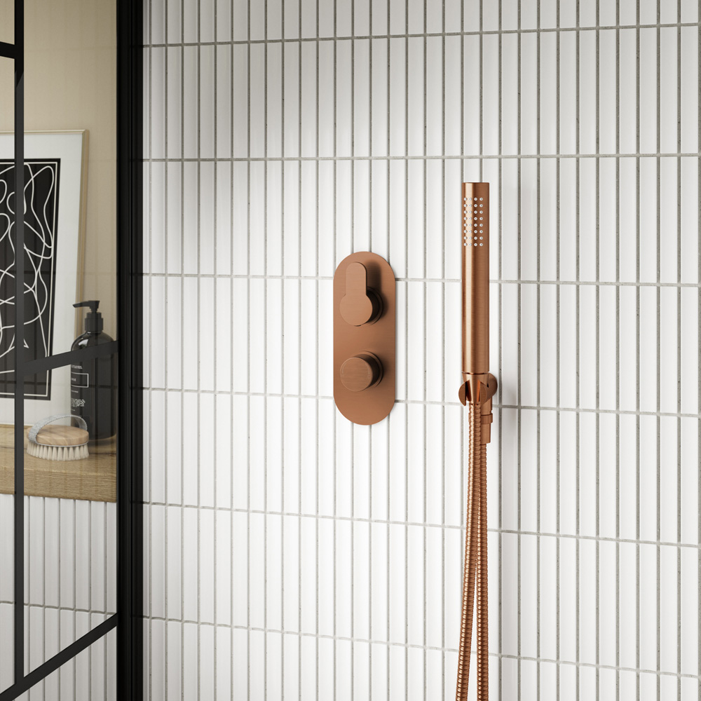 Enhance your bathroom with the nuie Arvan Brushed Bronze Twin Thermostatic Valve. Crafted from premium brass and ABS, this valve showcases a modern, minimalist design finished in brushed bronze finish. Its adaptable installation allows for vertical or horizontal positioning. The thermostatic mechanism ensures precise flow control, maintaining temperature within a variance of only two degrees, even amidst fluctuating water pressures. Moreover, it incorporates thermal protection to prevent scalding in the event of hot or cold water cessation. The valve complies with safety standards to promptly cease operation. Its distinctive cartridge exhibits exceptional resistance to calcium accumulation, even in demanding water conditions. Versatile across all systems, including gravity-fed, pumped, unvented high-pressure, and fully modulated combi-boilers, it guarantees superior flow rates even at low pressures. Furthermore, the reversible cartridge obviates the necessity for re-plumbing, provided the hot and cold supplies are correctly oriented. You can also change your cartridge by disassembling it, rotating it 180°, and reinstalling it.