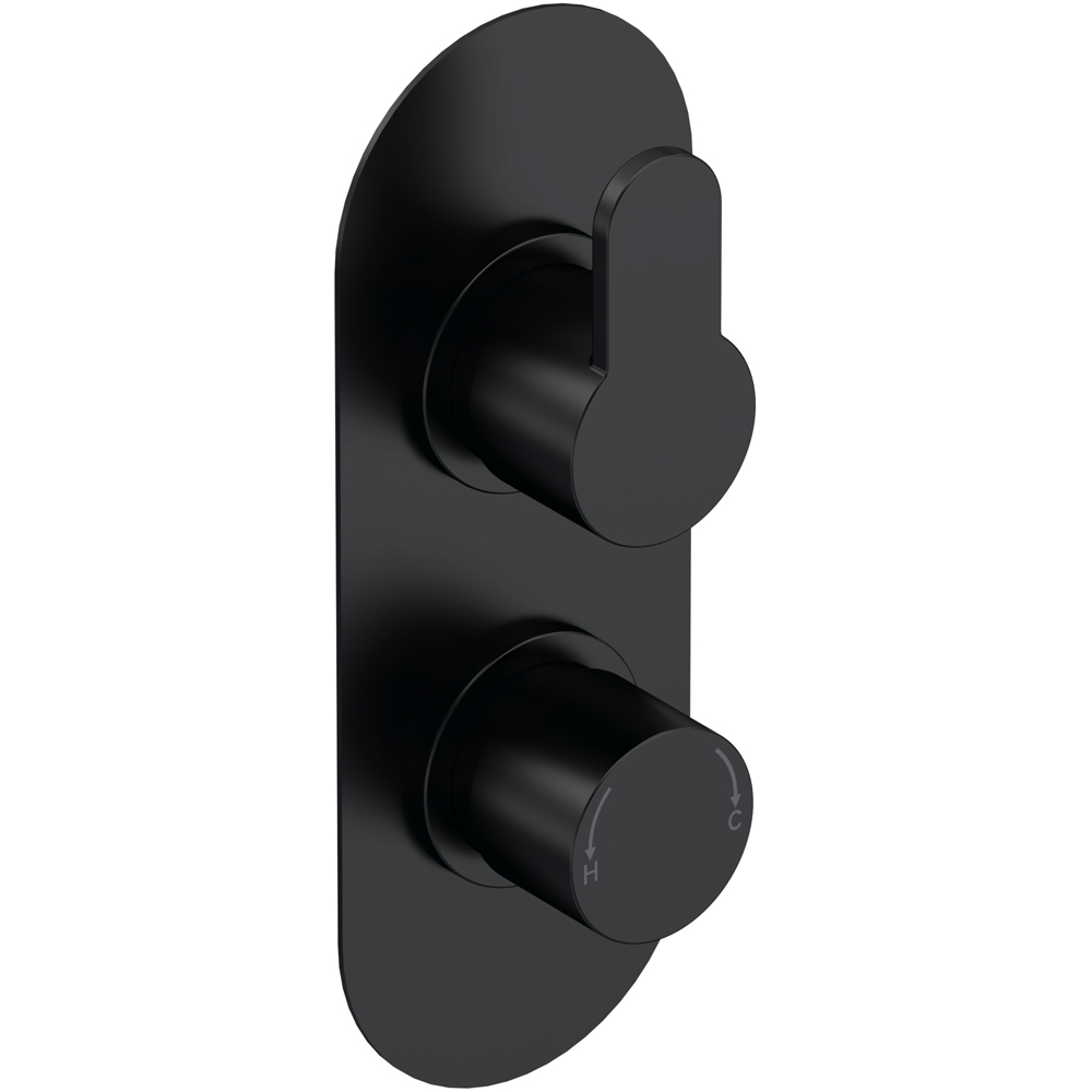 Enhance your bathroom with the nuie Arvan Matt Black Twin Thermostatic Valve with Diverter. Crafted from premium brass and ABS, this valve showcases a modern, minimalist design finished in matt black. Its adaptable installation allows for vertical or horizontal positioning. The thermostatic mechanism ensures precise flow control, maintaining temperature within a variance of only two degrees, even amidst fluctuating water pressures. Moreover, it incorporates thermal protection to prevent scalding in the event of hot or cold water cessation. The valve complies with safety standards to promptly cease operation. Its distinctive cartridge exhibits exceptional resistance to calcium accumulation, even in demanding water conditions. The valves are suitable for medium-pressure water systems. Furthermore, the reversible cartridge obviates the necessity for re-plumbing, provided the hot and cold supplies are correctly oriented. You can also change your cartridge by disassembling it, rotating it 180°, and reinstalling it.