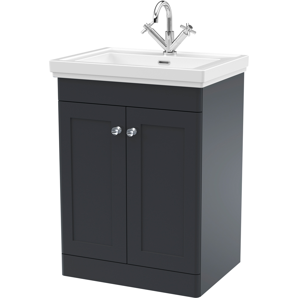 The nuie Classique 2 Door Soft Black Floor Standing Vanity Unit with 1 Tap Hole Fireclay Basin 600mm combines vintage charm with a modern touch, perfect for any contemporary bathroom. The soft black colour complements a range of bathroom styles. The floor-standing design offers ample storage, making it perfect for a busy family home. The unit features two soft-close doors that limit daily wear and tear, providing a quieter closing action. Plus, it also serves as a storage space for your essentials. Chrome handles come as standard, adding a touch of elegance. The set comes with a fireclay basing that has one pre-drilled tap hole. It is supplied rigid for easy installation with a five-year manufacturer's guarantee to ensure complete peace of mind and customer satisfaction.