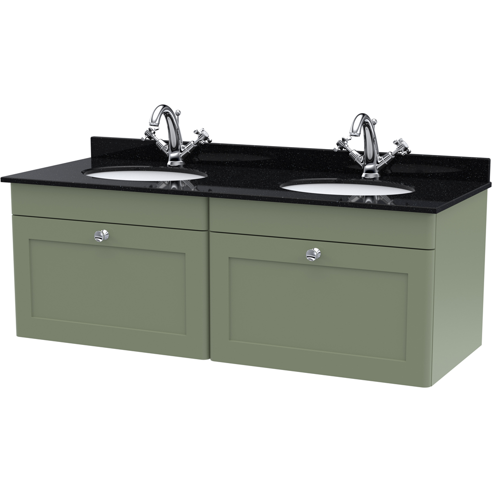 Give your space a luxurious feel with the nuie Classique 2 Drawer Satin Green and Black Wall Hung Unit and 1 Tap Hole Marble Basin 1200mm. This stunning piece intertwines a classic vintage aesthetic with contemporary elegance. The seamlessly closing drawers minimise everyday wear and tear while providing a quiet and gentle closing experience. Complete with a single tap hole and an elegant marble top, complemented by a beautiful oval-shaped basin, the unit boasts exquisite chrome handles. Crafted using cam and wood dowel techniques, the piece features a sleek MFC-painted matte finish. Additionally, it includes a generous five-year guarantee. Dimensions: 445 x 1220 x 463mm.