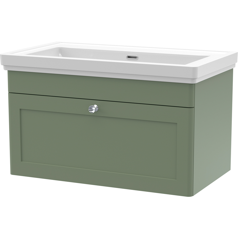 nuie Classique Single Drawer Satin Green Wall Hung Unit and 0 Tap Hole Fireclay Basin 800mm