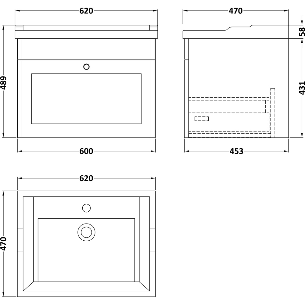 Experience the blend of functionality and beauty with the nuie Classique Single Drawer Satin Green Wall Hung Unit and 3 Tap Hole Fireclay Basin 600mm. It seamlessly blends vintage style with a contemporary twist. This product features soft close drawers that limit daily wear and tear and provide a quieter closing. Chrome handles come as standard on the unit to elevate the quality of the product. Plus, it also serves as a storage space for your essentials. It is supplied with a high-quality fireclay basin and comes with a five-year guarantee. Dimensions: 489 x 620 x 470mm.