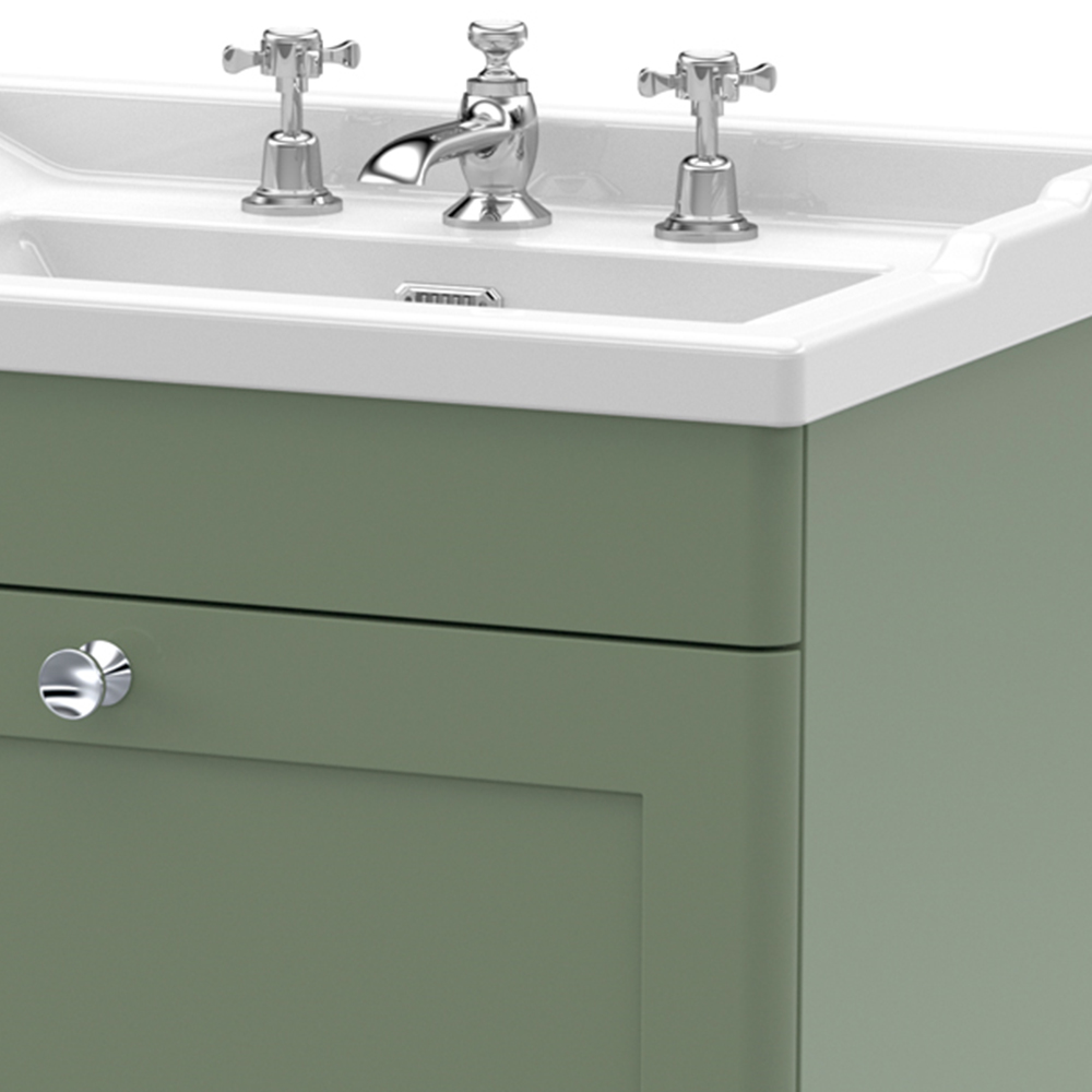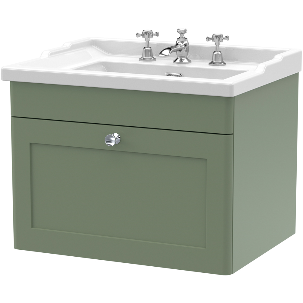 nuie Classique Single Drawer Satin Green Wall Hung Unit and 3 Tap Hole Fireclay Basin 600mm