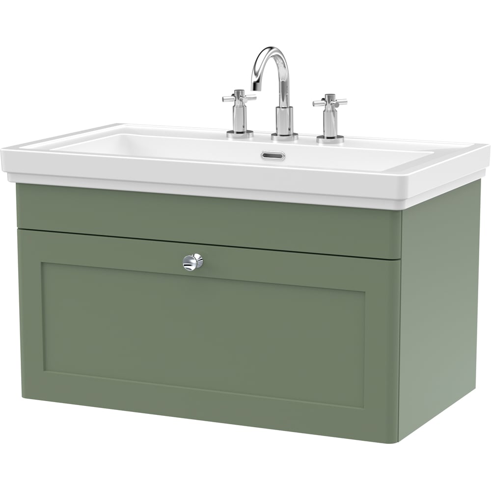 nuie Classique Single Drawer Satin Green Wall Hung Vanity Unit and 3 Tap Hole Fireclay Basin 800mm