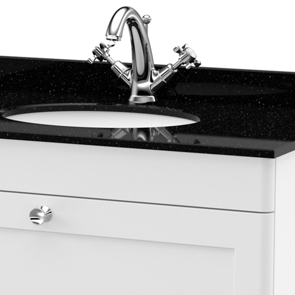 Give your space a luxurious feel with the nuie Classique Single Drawer Satin White and Black Wall Hung Unit and 1 Tap Hole Marble Basin 800mm. This stunning piece intertwines a classic vintage aesthetic with contemporary elegance. The seamlessly closing drawer minimises everyday wear and tear while providing a quiet and gentle closing experience. Complete with a single tap hole and an elegant marble top, complemented by a beautiful oval-shaped basin, the unit boasts an exquisite chrome handle. Crafted using cam and wood dowel techniques, the piece features a sleek MFC-painted matte finish. Additionally, it includes a generous five-year guarantee. Dimensions: 445 x 820 x 463mm.
