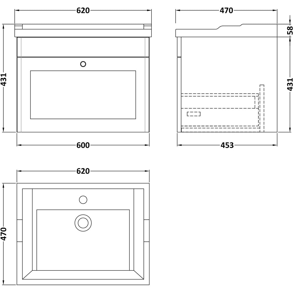 nuie Classique Single Drawer Satin White Wall Hung Unit and 1 Tap Hole Fireclay Basin 600mm