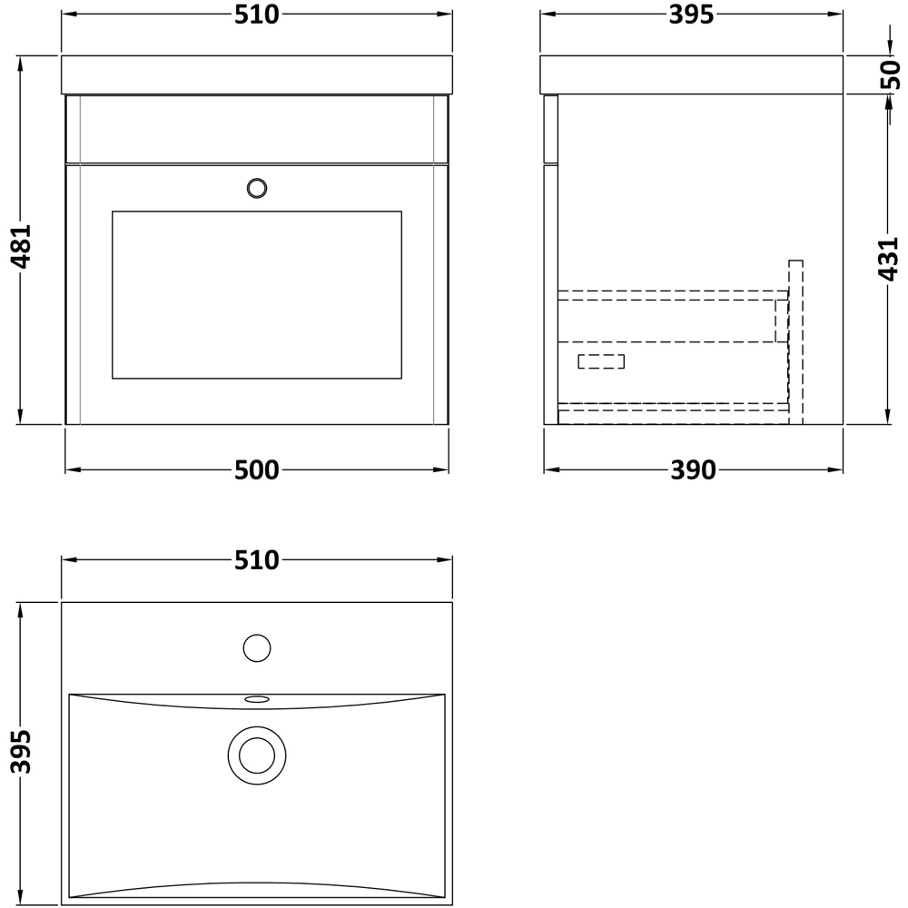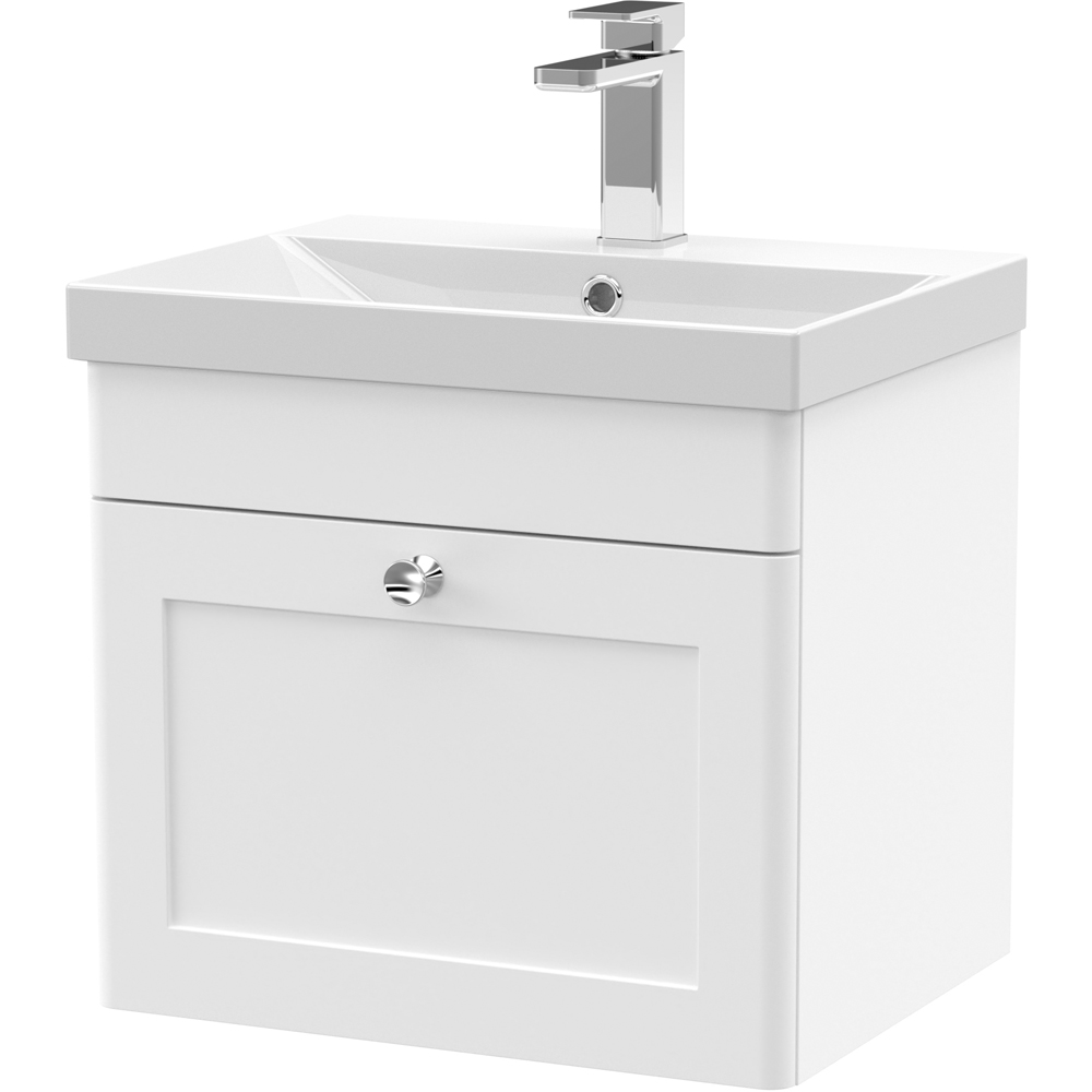 nuie Classique Single Drawer Satin White Wall Hung Unit and Thin Edge Ceramic Basin 500mm
