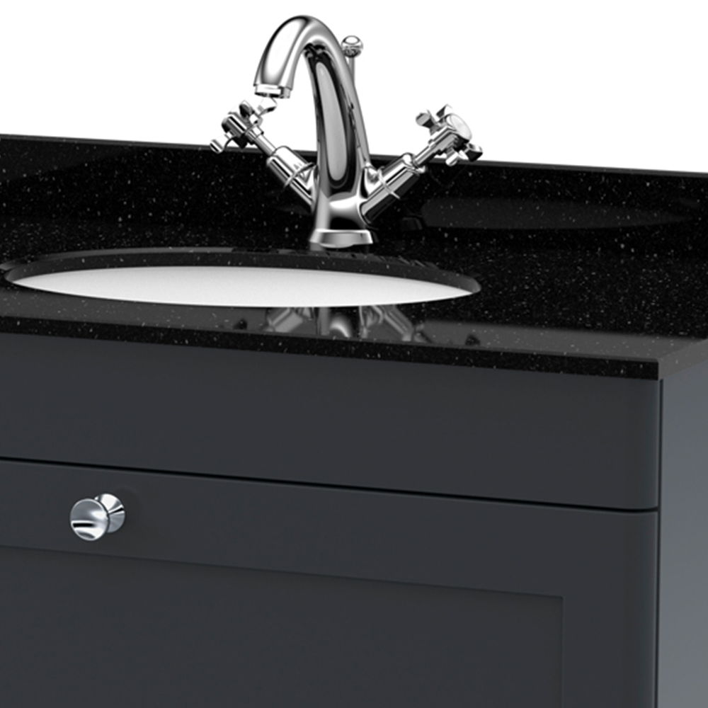 Give your space a luxurious feel with the nuie Classique Single Drawer Soft Black Wall Hung Unit and 1 Tap Hole Marble Basin 800mm. This stunning piece intertwines a classic vintage aesthetic with contemporary elegance. The seamlessly closing drawer minimises everyday wear and tear while providing a quiet and gentle closing experience. Complete with a single tap hole and an elegant marble top, complemented by a beautiful oval-shaped basin, the unit boasts an exquisite chrome handle. Crafted using cam and wood dowel techniques, the piece features a sleek MFC-painted matte finish. Additionally, it includes a generous five-year guarantee. Dimensions: 445 x 820 x 463mm.
