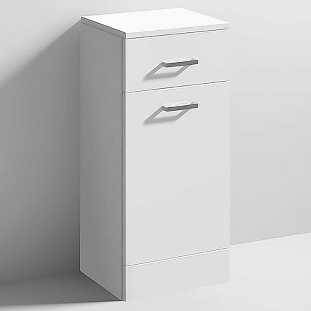Enhance your modern bathroom with the nuie Mayford Gloss White Floor Standing Laundry Basket 350mm. Its sleek gloss white finish adds a designer touch to any contemporary space. Ideal for busy family bathrooms, this unit offers ample storage. Enjoy the quiet, smooth closing action of its soft close drawers, minimizing wear and tear for long-lasting use.