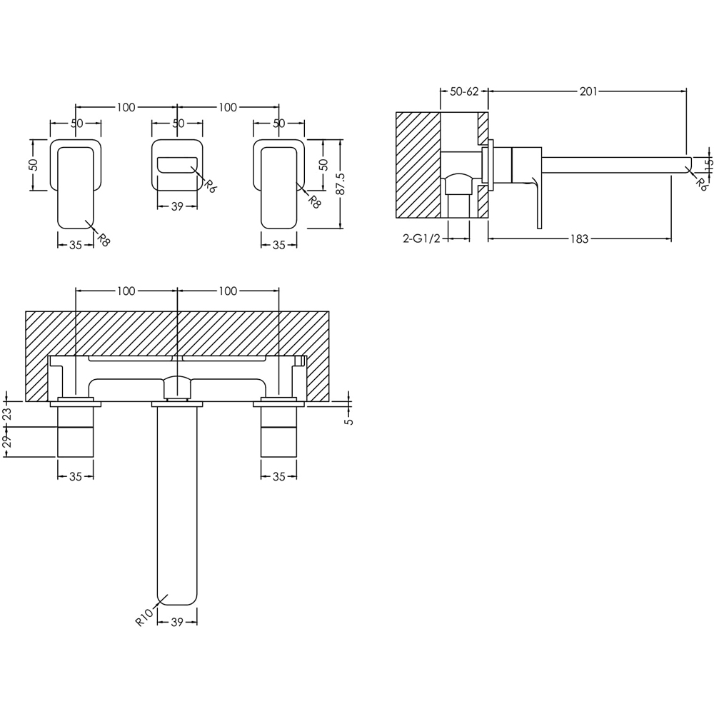 nuie Windon Chrome Wall Mounted 3 Tap Hole Basin Mixer