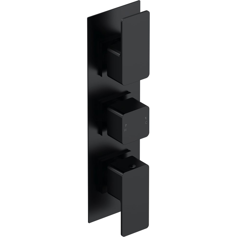 Enhance your bathroom with the nuie Windon Matt Black Triple Thermostatic Valve with Diverter. Crafted from solid brass, this valve showcases a modern, minimalist design finished in matt black. Its adaptable installation allows for vertical or horizontal positioning. The thermostatic mechanism ensures precise flow control, maintaining temperature within a variance of only two degrees, even amidst fluctuating water pressures. Moreover, it incorporates thermal protection to prevent scalding in the event of hot or cold water cessation. The valve complies with safety standards to promptly cease operation. Its distinctive cartridge exhibits exceptional resistance to calcium accumulation, even in demanding water conditions. Versatile across all systems, including gravity-fed, pumped, unvented high-pressure, and fully modulated combi-boilers, it guarantees superior flow rates even at low pressures. Furthermore, the reversible cartridge obviates the necessity for re-plumbing, provided the hot and cold supplies are correctly oriented. You can also change your cartridge by disassembling it, rotating it 180°, and reinstalling it.