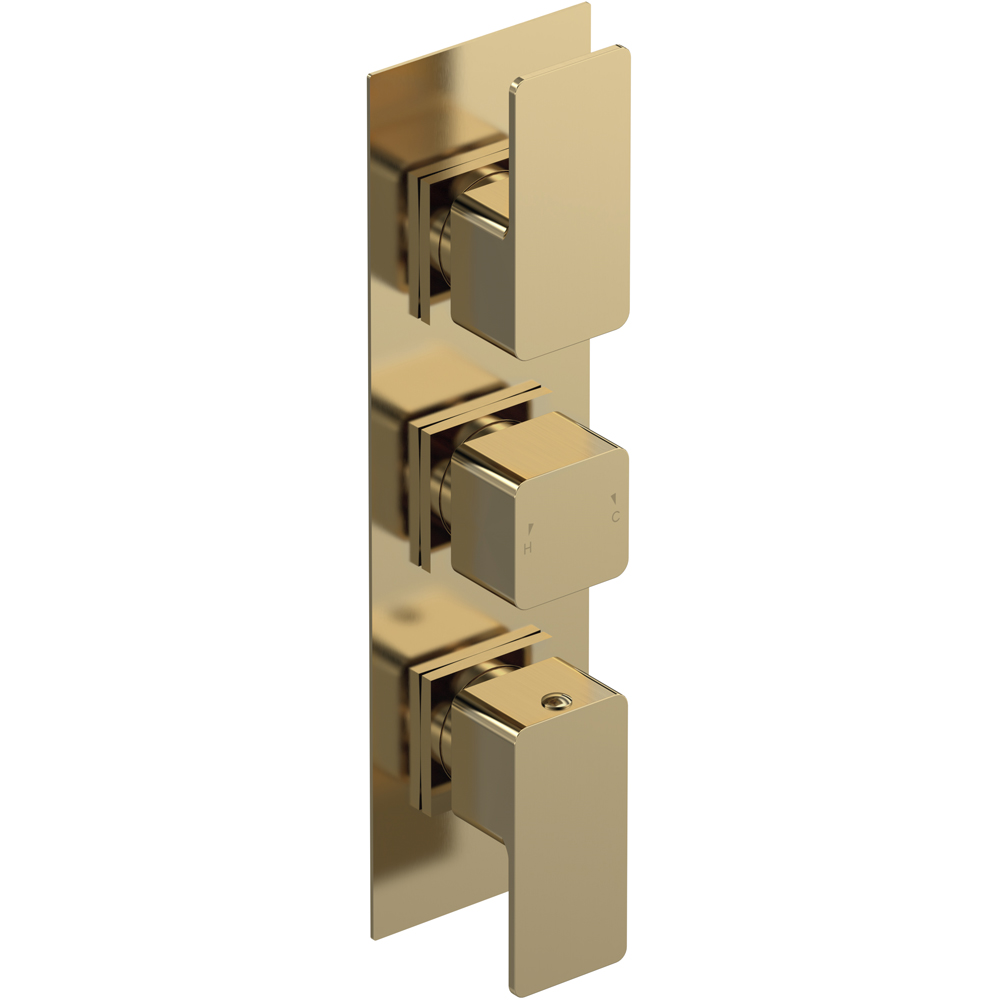 Experience an indulging and relaxing bath time with the nuie Windon Triple Brushed Brass Thermostatic Valve with Diverter. Crafted from solid brass, it provides full thermal protection and helps prevent scalding by shutting off the valve when there's hot or cold water failure. The valve features thermostatic control to +/- 2 degrees and provides great flow rates even at low pressure. It's also highly resistant to calcium buildup and is suitable for use in hard water areas. Compatible with gravity-fed, pumped, unvented, high-pressure, or fully modulated combi-boilers, this cartridge can be fitted vertically or horizontally. Plus, it flaunts a minimalist design and a brushed brass finish to give your bathroom a sleek look.