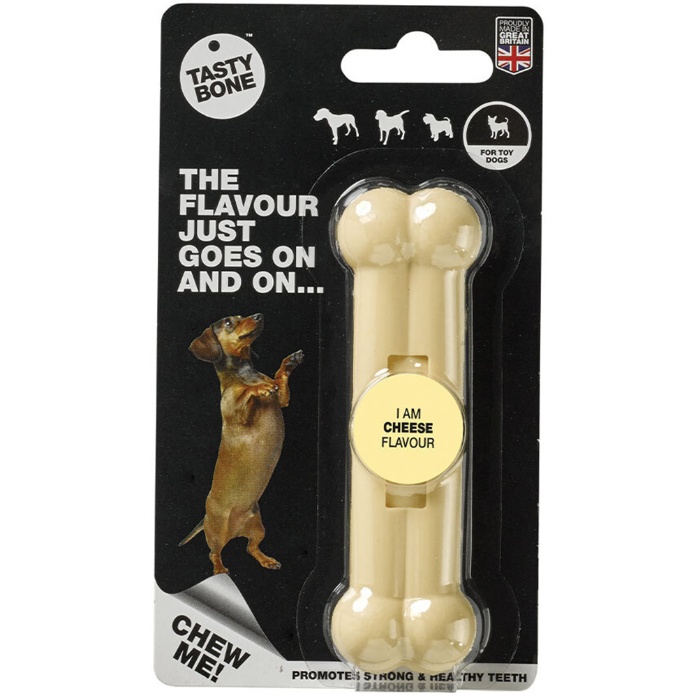 Like all of the TastyBone nylon chew toys, this tasty Nylon Chew Bone Cheese has been tested on the most vigorous of chewers. Made from 100% virgin nylon, it is guaranteed to last. Uniquely infused with an irresistible cheese flavour right through to the core, your dog will never get bored, as the flavour will last for the lifetime of the bone. With every bite, your dog's gums and teeth become stronger and healthier, reducing plaque and tartar build-up.