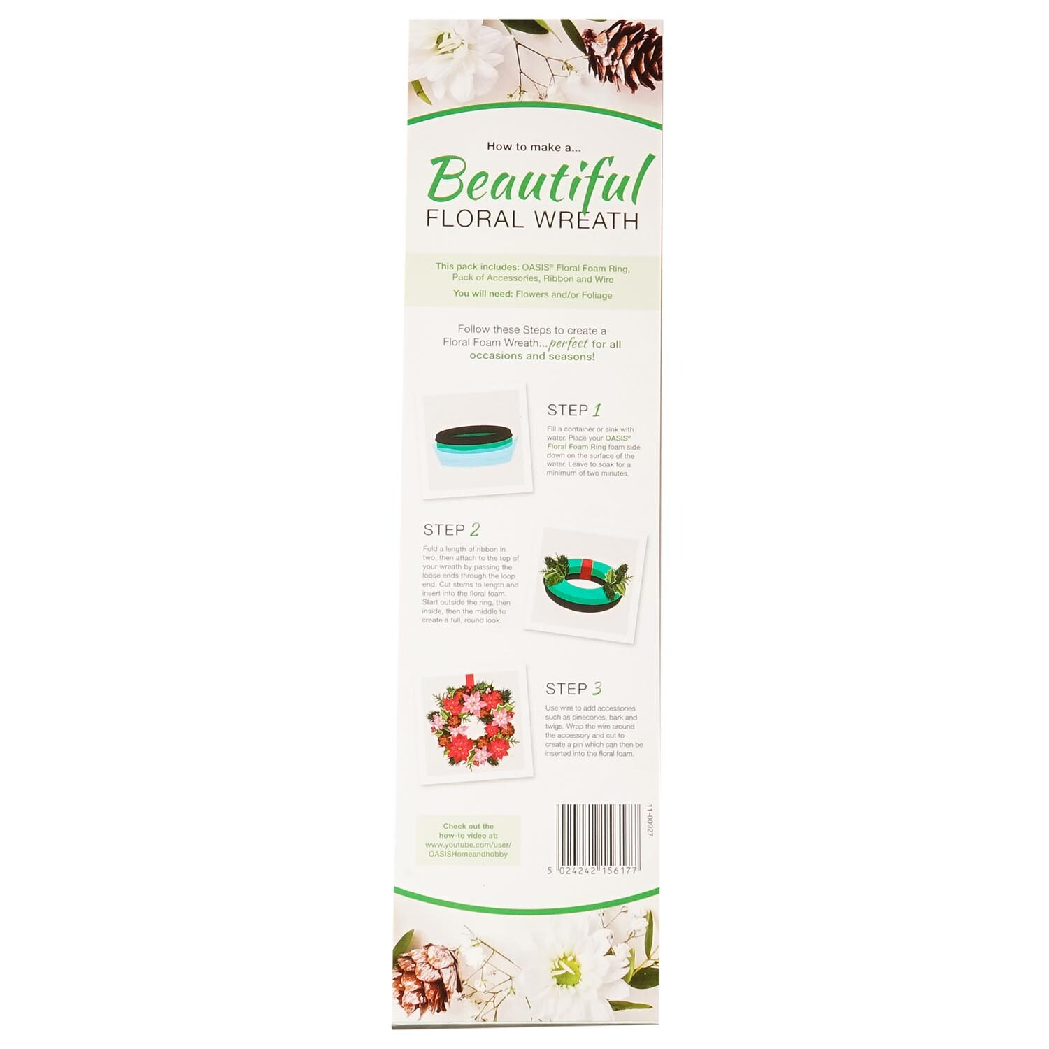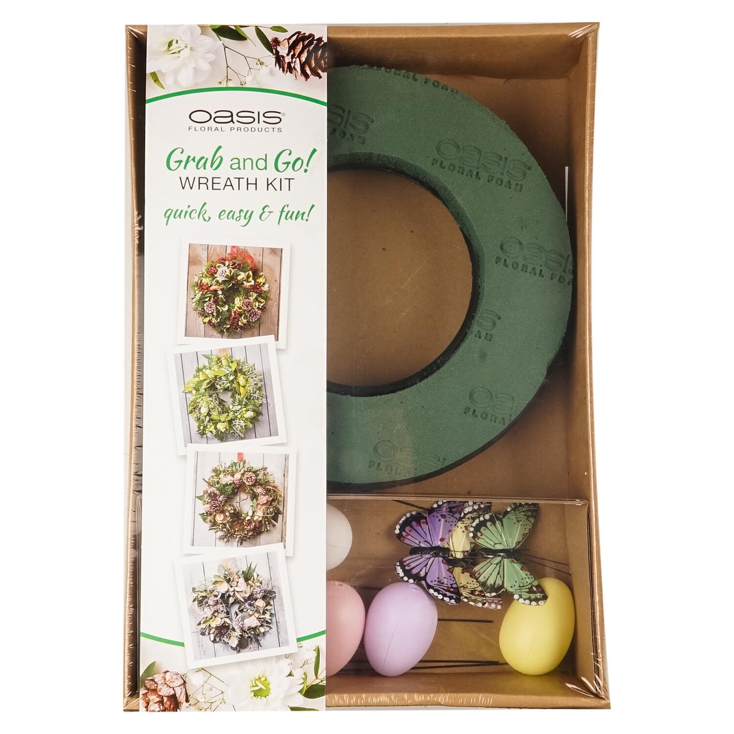 A handy grab and go kit which includes all the items you need to help create your very own floral wreath at home! All you have to do is add flowers and foliage of your choice! This helpful kit includes an Oasis Naylorbase 25cm foam ring, some yellow ribbon, four plastic eggs in different colours, some beautiful wired butterflies in a variety of colours and 6 stub wires. Instructions on how to construct your wreath are found on the back of the pack to help you create a gorgeous wreath!