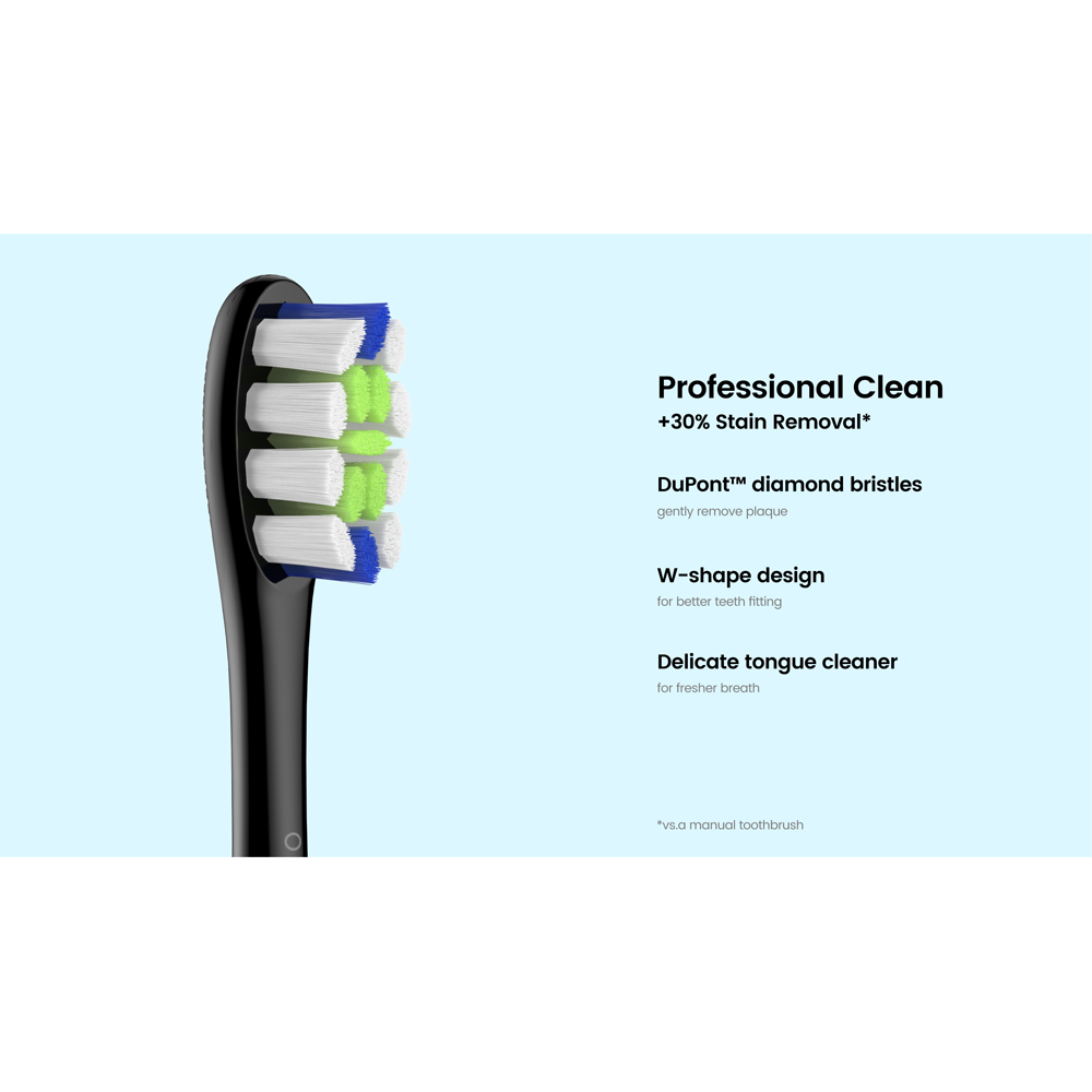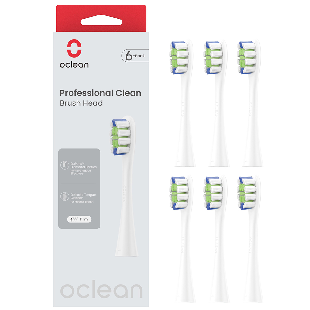 The Professional Clean brush heads can effectively and gently remove plaque for your daily routine needs. They feature certified bristles, a compact brush head design, and oral-safe materials.