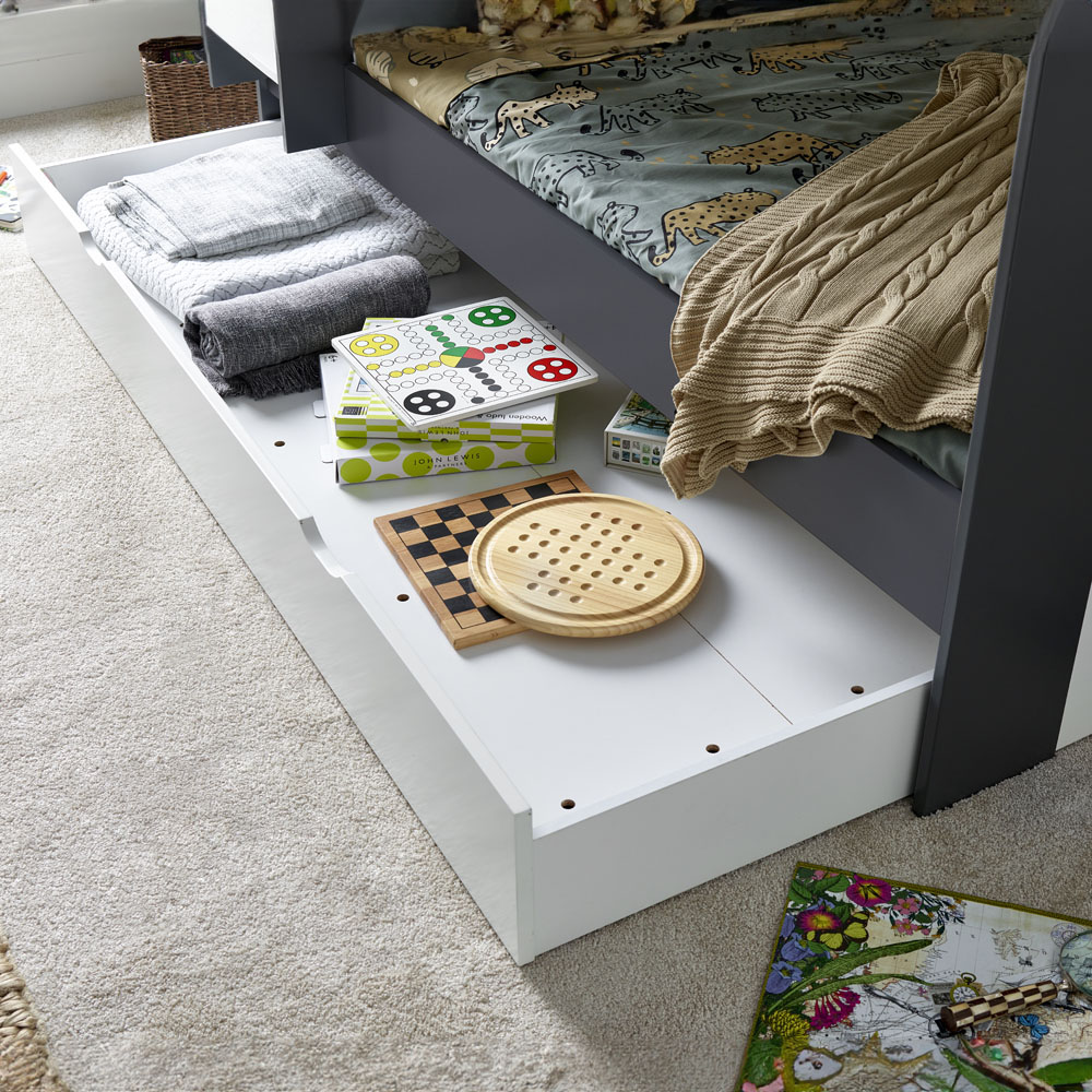 Discover the art of restful living with this Bedmaster Oliver Grey and White Storage Bunk Bed with Memory Foam Mattresses, a perfect blend of style and practicality. Made from solid rubberwood and superior quality materials, both top and bottom tiers have shelves and dividers, which are perfect for books, toys and any other bedroom trinkets. The ladder on this bunk, which can be assembled to fit left or right, has cut-out handles and sits close to the frame. Its lower bunk is also positioned close to the ground, making it safer for your child while also creating a more open feel in the room. This bunk bed can be purchased with or without the pull-out storage drawer. Fits Single-size mattresses. This comes with two Bedmaster Noah Single Memory Foam Spring Mattresses. These micro-quilted 13.5 gauge coil one-sided memory foam mattresses are tested to BS7177. Supplied flat-packed to a room of choice. Self-assembly required. The gap between bunks is 67cm. Bunk size: H173 x W125.1 x L196.6cm. Drawer size: H23.5cm x W80.3cm x L192cm. Mattress depth: 15.5cm.