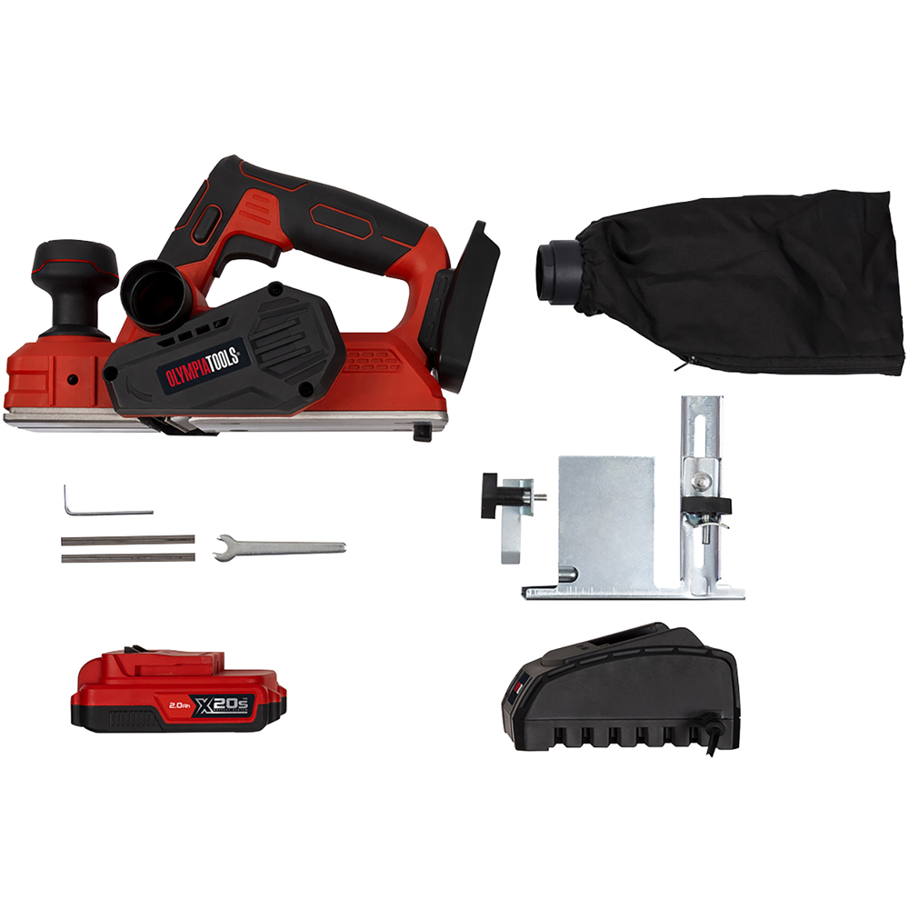 Make a functional addition to your toolbox with this Olympia Power Tools X20S Planer 20V. It features a powerful motor that provides you with a smooth planning performance and a cordless design that allows you to use the planer at any angle. With a soft grip handle offering added comfort and control, this planer is also fitted with a dust bag to help you keep the surroundings free from debris and dust. This robust planer comes with one 20V 2.0Ah Li-ion battery, one charger, one parallel guide, one rebate guide, two reversible blades, one hex key, one spanner, and one removable dust bag for your convenience.