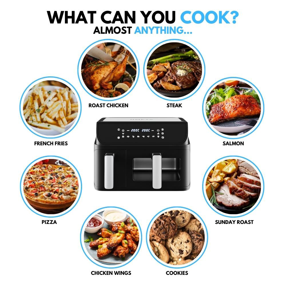 Introducing the Ometa AirCombo 9.5L Dual Air Fryer that offers a generous cooking capacity, 10 cooking modes, dual-zone cooking and more. The AirCombo air fryer is the perfect cooking appliance for your home! This 9.5L dual air fryer comes with all the accessories you could need to cook up a storm. The air fryer basket comes with a crisper plate. Use the 10 pre-set cooking settings, the match and sync cook functions, or customise your cooking using the adjustable timer and thermostat. Keep an eye on your food using the windows.